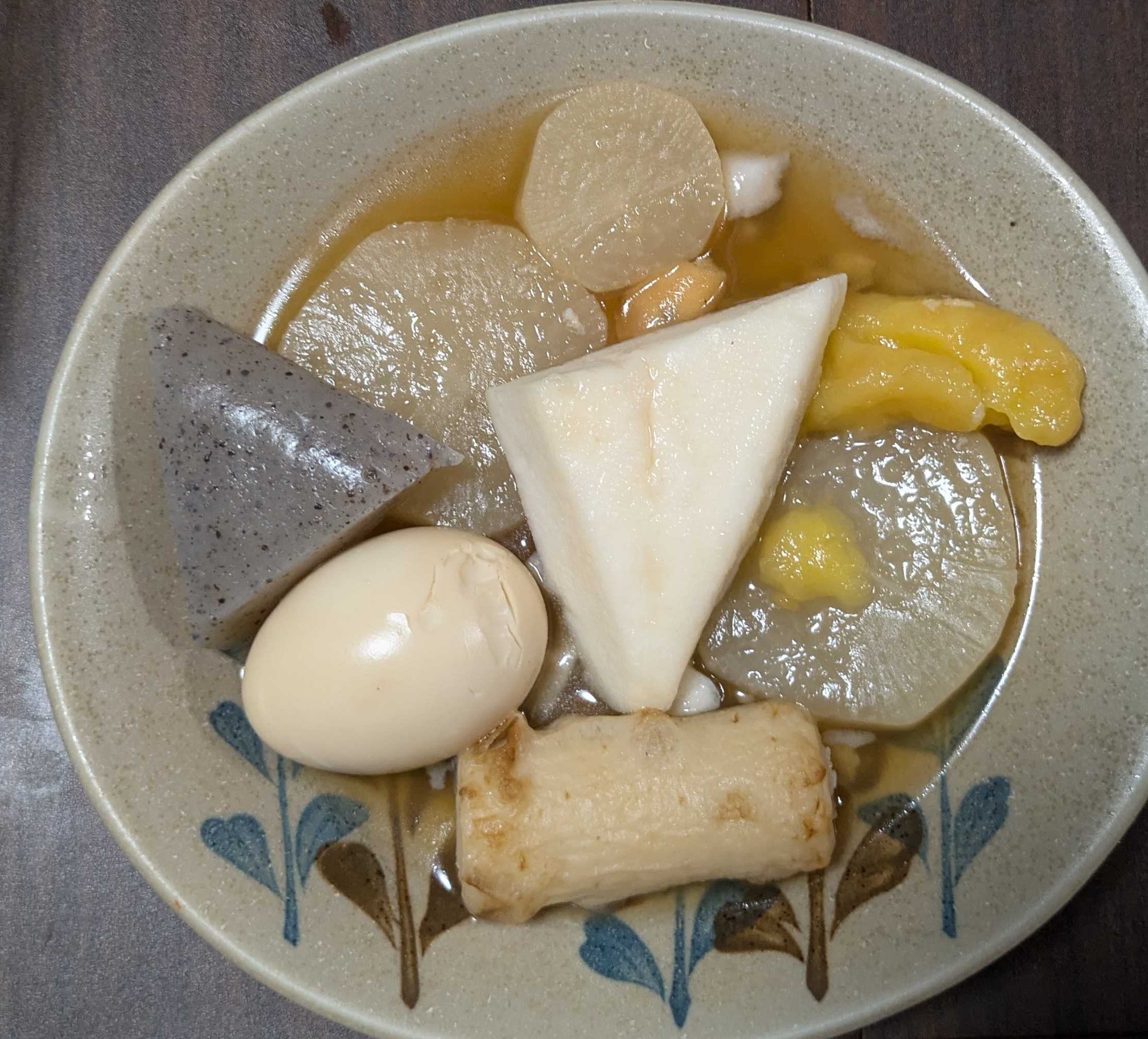 男料理(夕食)おでん 大根 はんぺん 蒟蒻 茹で玉子 ちくわ