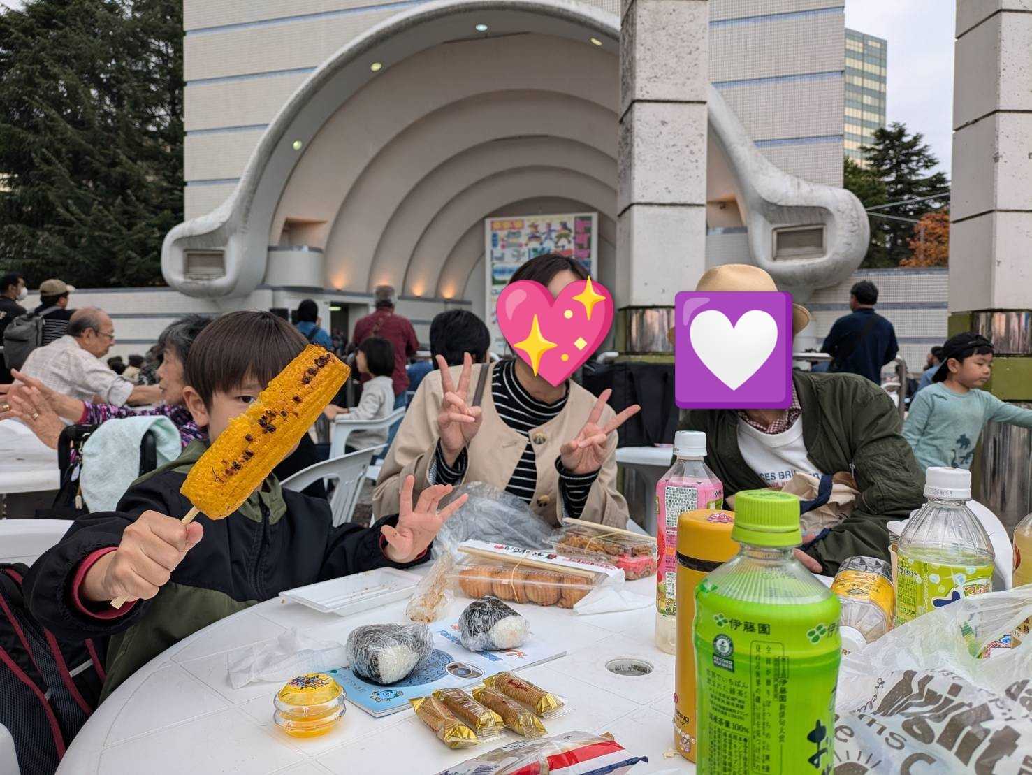野外ホール前のテーブルでおにぎりやおいなりさんでランチしました