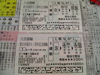 昨日の夕方から、カミさんとお地蔵さんに出掛けたのがいけなかったようで、風邪を引いてしまいました。行きは元気一杯だったのですが、人ごみを歩いている内に具合が悪くなり、帰りの道のりの何と長かった事。結局は、夕飯の買い物などもして来たのですが、我が家に帰り着いた午後7時過ぎには、即就寝。今朝カミさんが仕事に出掛ける午前7時頃まで布団の中、口にしたのは、露天で買ったたい焼き1ヶ、本日も牛乳を温めて飲んだだけですから、力が出ません。それでも1時過ぎまで寝ていたので、いくらか良くなりました。そうなると、新聞を持ち出して競輪予想。結局、たっぷりと着込んで、8Rから購入して来ました。飛び込みの、 8R: 3=5-1267を100円的中。 9R: 逃げるのは稲垣でしょうが、末がないと読んで、 他の先行屋の捲くりを狙い、9-35-354、6-57-574.8-35-354.。 結果、8-3-5 的中。10R: 金山から、5-13-1324.。11R: 今日は、伏見が2段でしょうから、3-148-14829.。 力で武田が捲くり切るなら、1-39-3948.。1=3-489.。今日はお休みにしようと思っていたのですが、無理して購入に走った甲斐が有ったようです。カミさんには、寝ているように言われたので、出掛けたのは、内緒にしておきましょう。 9R 8-3-5 32,670円今の私の状態です。