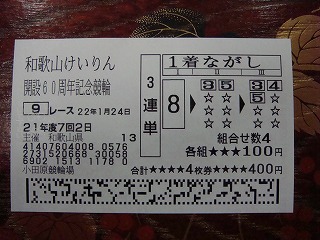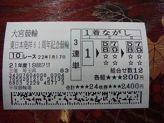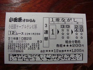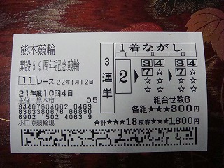 本年最初の競輪予想となります。遅めの食事を取って、競輪場に着いたのは3R前、A級の準決勝くらいは現場で打って帰る予定で、ブラブラしながら暮れの抽選で味をしめたので抽選場を覗いてみると、本日は4R終了後から、ハズレ券3,000円分で1回抽選との事。道理でゴミ箱を漁る人や子供が多いです。場内の美化には良いのかも知れませんが、何だか見たくはない光景です。そんな訳で、本日の抽選会は諦めて、前回の抽選の時に車券の確認をしていた若者に、「未確定車券の方が良いのにね~」と声を掛けると、「あの~、もしかして博打さんですか?」私「博打さん?」彼「ブログの?」私「え、ブログは書いてますが、なぜ?」彼「読んでいて、あの日、ブルゾンを当てたのは二人しかいませんでしたから」 「内緒ですか?」私「いえいえ、びっくりしただけですよ」変な事は出来ません。それでも、うれしい出来事でした。10R: ダイジェストを見た限りでは長塚の伸び脚には余裕が有ったので、 ここは不動かな、1-2789.。 山口の千切れを期待したいですね。 押さえで吉永のの先捲くりで児玉の差し、9-12-1278.。11R: 栗田の力が上なのでしょうが、中団から突っ込む牧に期待して、 2-459-45937.。 押さえで、5-27-2749.。12R: ここも吉田が上位で、5-1-39.。萩原が付いていったら諦めかな。 番手木村が恵まれて、1-359-3598は遊び。面しろいレースは有りませんでした。PCがおかしくなって、変換するとへんな文字に変わります。寿命かな。お金がないので、新品は買えませんので、大事に使っていくしかない。駒ったな~