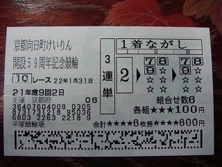 懲りずに競輪購入に行って来ました。11R優秀戦: 小嶋、荒井、三宅、平原、この4車の動きが良い。 並びは、地区が違う先行屋同士が連携ですから、何とも難解。 中村辺りがカマシ先行を打つと読んで、番手三宅から、 4-129-12957.。 地元、平原が仕掛け処を掴んでいますので、9-1247.。 4=9-127.。その他 8R: 藤田が捲くり展開に持ち込み、1-247-2473.。 混戦なら山富の差し、2-17-1748.。 9R: 地区違いでも神山が付くなら、佐藤は行く事になりそうで、 神山も仕事はするでしょう。 間隙を突いて来るのは佐々木で、5=7-368.。10R: ここは山崎が上位でしょう。 捲くり展開で、平沼は切れると読んで、1-5789.。 絞るなら、関東3番手から伸びそうな筒井で、1-5-789.。 本日は3Rまで打って帰って来ましたが、すべてゴール寸前までは楽しめたのですが、当たりは3Rのみ、それでも前売りで買って来た4Rが1枚引っ掛かりましたので、負けは無さそうです。それにしても、熱が出そうな結果でした。1R:長谷から3-1578、3着6番とは2R:藤木と渓から購入しましたが、追加の8番田淵が買えません。 小舟さんは、しっかりと常川絡みで8番車も入れて取っているようですから、 好調な人は、閃きが違うようです。 下のコメントで私に乗って、全敗の方に小舟さん予想を勧めた甲斐が有りました。3R:ここは堅く、1-345。 さすがに安かった。4R:川口の捲くりから、1-67-6739.。格上中塚の差しで、7-13-1389.。 1=7-36.。 川口が捲くって直線、中塚がインを強襲して、7-1も3着は3.6で接戦。 7-1-6 20,480円。100円でしたが助かった。5R:赤井の捲くり期待で、2-359-3597.。 宮内のイン粘りも有ると読み、1-25-2579.。5-12-127. 結果は赤井の捲くりに宮内が追走となり、「差せ~」と怒鳴ったのですが、 2-1-5.。 また疲れが出ました。6R:舘から買っても5番は買えませんでした。7R:桂馬に期待。さて、本日は、どうなりますか。結果10R: 1-9-7 4,550円山崎の捲くりに平沼が千切れて前残り決着でしたが、前反が突っ込んで来たので、大本命が頭でも何とか配当が付きました。4R: 7-1-6 20,480円1枚でも浮きが出れば、御の字です。11R優秀戦は平原と小嶋が踏み合う展開で、脚を残した石毛が漁夫の利を掴んだのですが、3着の6番車にはびっくりしました。30万車券になる訳ですね。9Rの神山の700円配当の3連単があっただけに、何か笑ってしまいました。