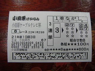 昨晩の旅番組で、熱海梅林などが取り上げられていましたので、本日は、夫婦共に仕事休みですので、湯河原幕山辺りでも歩く心算でしたが、天候がいまひとつですので、諦めて映画でも見る事にしました。そうなると、やはり{アバター}なのでしょう。タイタニックの興行収入を超えたらしいですから、見て置かないと時代に取り残されるような事になりかねない。別にもう取り残されつつありますから、構わないのですが、タイミングが合ったと思って、見て来ます。年寄りには、字幕より吹き替えがお勧めとの事ですから、調べたら、日に1回しか有りません。それも3時半ごろからですから、帰りは暗くなりそう。それまでは、時間潰しに近くをウオーキングする事になりそうです。本当は競輪場で遊んでいるのがベストなのでしょうが、カミさんが一緒ではそうはいきません。それに本日の小田原は碌な番組が組まれてはいません。準決勝戦も特選組の力が上の感じがしますので、配当的な妙味は薄い。それでも、前売りだけは少し買って来ましたので更新して置きます。10R: 徹底先行型は牛山だけですが、脚は重そうで、 やはり友定の捲くりが上でしょう。 2-789-78914.。11R: 逃げ屋が多くて混戦模様ですが、捲くりの威力では中村一将。 7-235.。7=2-35.。12R: 大井の出来が良さそうで、谷津田が2段で出るなら穴も有りそうですが、 反応が悪く、松岡の捲くりを止め切れないと読みます。 1-39-3924.。9-13-1324.。 安くても、1=9-234.。1点で、1-9-3.期待。その他のS級戦は、雑魚ばかりですので、パス。 4R:初日、好気合のカマシを見せた須藤の捌きを期待して、1-359.。前半戦も4Rだけ購入。(100円づつですから、600円投資)今日も期待は松岡ですね。では出掛けますので、結果は夜にでも。結果。12R: 1-9-3 2,390円4R、狙った須藤が捌いて3番手ですから、突き抜けを期待したら、届かず。10R、友定は立ち遅れて2着突っ込みが一杯。11R、一将はカマシて千切ったのですが、仕掛けが早かった分だけ直線では失速。12R、ここも松岡が絶好の4番手をキープと思ったら、インから萩原に来られたので、 ジャン過ぎに仕掛けてしまいました。 こうなると、何とか山富に残して貰いたいと願ったら、 捲り上げた谷津田を牽制した分だけ差し損ねたようで、助かりました。 映画を見て、日当が出たのですから、良い一日でした。アバターの感想は別に書きます。