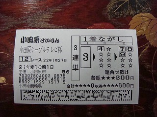 本年元旦の富士山競輪、競馬と散々遊んで来て、「喪中につき。。。。」と言うのもなんですが、新年のご挨拶はなし。それでも、 皆様、本年も宜しくお願い致します。元旦はいつもの如く、家族で日帰り温泉。朝9時に我が家を出発、箱根越えで御殿場へ出ますので、車中でアウトレットの話になり、娘が携帯で調べたら元旦から営業との事。10時からの営業らしいので、それならちょっと寄って、「福袋でも購入するか」と東名インター方面に直進。 何と、まだ9時半過ぎだと言うのに大渋滞、広大な周辺の駐車場は満車らしく、係員が大量に出て、逆方向に車の列を誘導しています。諦めて、茶目湯殿に向かったのですが、そちらの方面の臨時駐車場も、ほぼ満車らしいのですから、何万人が来たのか想像がつきません。不況の影響なのかな~。そんな訳で茶目湯殿も、例年と違い混んでいました。それでも限られた人数しか入れませんので、他所の温泉とは違って快適でした。昼には振舞い酒とビールなどを飲んで、夜までゆったりとして帰って来ました。それなのに、早くも疲れ気味なのは、Wiiのせいです。暮れに帰って来た娘が、私達夫婦の運動不足解消の為に、購入してくれる事になったので、大晦日の午前中に仕入れに行き、午後からは、遊びに来ていた甥っ子も入れて4人で大騒ぎ状態、ですので、昨日も帰宅後は3人でテニス等々で狭い部屋で運動です。その場で腕を振るだけで良いはずなのですが、勝手に体が動いてしまい、結構なカロリー消費になりそうです。スポーツ系のソフトを2本購入しましたので、色々と挑戦で、寝る間が有りません。何しろ初日の体力測定では、カミさんは45歳で実年齢より若い結果でしたので、嬉しそうでしたが、私は何と80歳。計測の仕方が判らない状態でしたから、それ程ショックではなかったのですが、カミさんに馬鹿にされたのが、「悔しいです!」それと、バランス系の競技も、まるでダメ、それならばと、甥っ子とゴルフで勝負も、ロングホールで海に落とし続けて、12、+7で惨敗。こうなると、性分として、夜中に起き出して特訓。私は元々「努力の人」ですので、遊びに関しては労を惜しみません。故に、しばらくは忙しい。それでも本日は小田原F1に参戦予定ですので、早速、競輪予想を載せる予定にしています。それでは、テニス特訓に入りますので、また後で。。。。