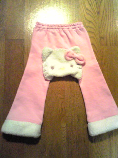 実はものすごーくキャラ好きな私。でも、社会人になってからはキャラグッズを買わないようにグッとこらえて2Dのデータとかで我慢してました。てか、このブログのタイトルの「きゃらけん」も「キャラクター研究所」だったんだよなぁ・・・。そのグッとこらえていたキャラもの購買熱がang*ang誕生と共に一気に噴出してしまいそうな今日この頃。てか、女の子ベビーがいるんだもん。いいよね?いいよね、いいよね?許されるわよね?(自己暗示)今、気になるのはケアベアとキティちゃん。キティちゃんは最近のキティちゃんじゃなくて、1975年の発売当初のベタッとした感じの昭和キティ柄が気になりまうす。。。ang*angが自我に目覚めてキャラの好みが出てくるようになるまで、ママの好きにさせてもらお。てなわけで、買ってしまったおしりにキテちゃんの顔がついたモンキーパンツ。セールで750円也。xingxingには「アホパンツ」と言われました・・・。