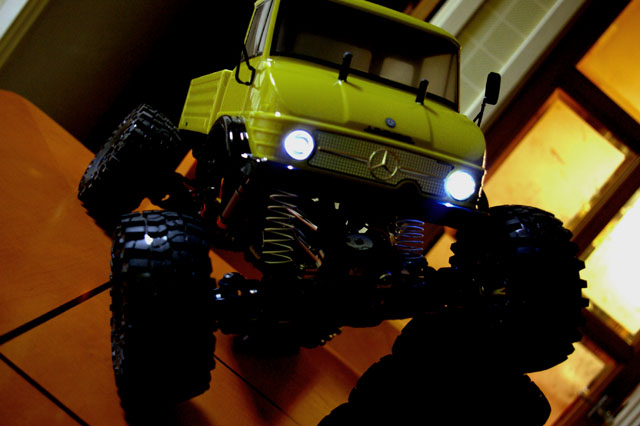 久々にボディを載せてみたのでパチリ。100円ライターのLEDをむしり取って装着。フロント:ホワイト、リア:レッド&オレンジなかなかの節約電飾でございます。ちなみに最初、抵抗入れ忘れて右のフロントライトが瞬死。ワイドトレッドにしてホイールベースも長めなので、ウニモグボディがあまり似合いません。そろそろボディ新調したいなぁ。ついでにボールエンドをRCTRAX製のモノに交換。地味な作業ですが、かなり可動域が広がりました。