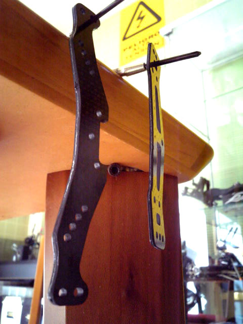 今日は時間が取れたので先日ゲットしたベンダーとカッターでロアリンク制作。野球部集合写真のバットのように並べてみる。カッターで固定する部分がくすんでしまいましたが、これは後から研磨するとして、かなりイイ感じに仕上がりました。気分をよくしてタイヤも作っちゃいました。行きつけのクルマ屋でバランスウェイトをゲット。テニス部集合写真のラケットのように並べてみる。今回はフロントに各80g、リアに各60g貼りました。さらに気分をよくしてモーターのメンテ。ツーリングと違ってモーターを外すのも一苦労なので長い間ノーメンテ。コミュも真っ黒。コミュ研とブラシ交換を敢行。写真撮るの忘れた。・゚・(ノД`)で、さっき作ったロアリンクとタイヤを組み込み、今日のCR-01さん。ついでに定番カットの足上げも。今日はこれで一日が終わりました。ダメな大人です♪