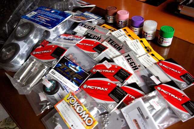 年に一度のラジコン市が15日にあったのでマイドームおおさかまで出掛けてきました。それなりに楽しめたけど、不景気の影響か去年より規模が縮小気味。デカール数枚とスペーサーなどの雑品、PROLINEのタイヤを購入。その後、スーパーラジコンにて狂ったように買い物(笑)いつも味わうラジパーツをカゴ一杯に入れてレジに行く時のドキドキ感。買い過ぎたやろーという焦燥感と、アレそんなもん?という得した感。この日の買い物は予算をはるかにオーバーして少し鬱に(笑)まぁ消耗品もかなり買ったので仕方ないかと自分を納得させてみる。そういえばラジコン市でオークションをやっていたのですが、SANWAのM11(AM27MHz)を28000円で落札した人がいたけど、スーパーラジコンのセールでM11のFM40MHzが20000円で売ってました。世の中なかなかウマくいかないモンです。