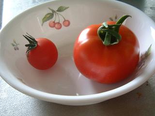 4月の終わりに植えたトマトが赤く実りました。すっごくおいしそう。でも・・・・ね大きいの。左側がスーパーで買って来たプチトマト。右側がうちで育ったトマト。・・・・・デカッ!!どうもミニトマトとミディトマトを間違えたみたい(爆)越前特産 越のルビー 高級ブランド トマト 【送料無料】中田さんの「完熟チェリートマト」2kg入り