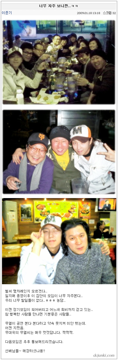 皆さまお久しぶりです このところ忙しいのでめちゃめちゃ久々更新です。で。。。遅くなりましたが昨日ジュンギがアップしてくれた写真と文を載せますねあまり頻繁に会うから・・・ふふ イ・ジュンギ2009.01.18 13:18すでに何回かわからない..イルジメ放映終了以後、この集団の集まりがとても頻繁にある..私たちあまりする仕事がない・・・フフフ冗談・・・今は定期会になってしまいいつのまにか会費まで集めていて・・・本当に幸せな人々、会えば気持ち良い人々・・・ムヨルの公演を見る見るといって約束守れないですまなかったけれど昨日は守った。舞台のムヨル氏は非常にすばらしかった。 パチパチパチ。次の集いは今後知らせて差し上げます。先輩たち~ヘジョンしましたか?
