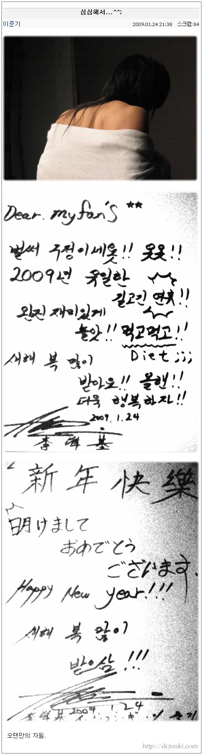 今年の「ソルラル(旧正月)」は1/26なので、ジュンギが新年の挨拶をアップしてくれました食べて食べてダイエット。。。?中国語、日本語、英語での挨拶も嬉しいですねお正月は家族と一緒に過ごしたいと云っていたので、今年はゆっくり出来るのでしょうかしかし。。。この色っぽいショットは何でしょう。。。 退屈で...^^; イ・ジュンギ 2009.01.24 21:38