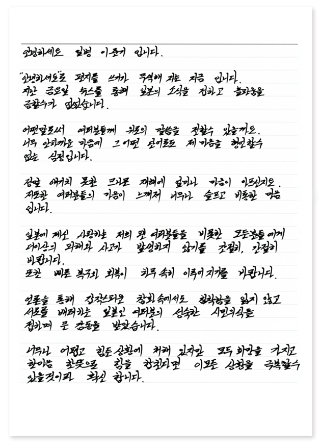 今回の東日本大震災に際し、被災なされた皆様方に心よりお見舞いを申し上げます。皆様の疲労や悲しみもさぞかし深いことと思います。くれぐれも体調を崩されませんように。またこの震災でご逝去なされたご家族、ご親族、ご友人の皆様のご冥福をお祈り申し上げます。私たち一人一人が出来ることはどんな小さなことでも全て協力し合って、共々に励ましあい、支えあいながらこの窮地を何としても乗り越えて行きたいです。今までも数々の困難を乗り越えてきた私たち日本人です。断じて負けない!勇気を持って、この未曾有の困難も希望を持って乗り越え勝ち越えて行きたい!世界中の皆様からも数々の激励が届いていますが、兵役中のジュンギさんからもメッセージが届きました。こんにちは。一等兵、イ・ジュンギです。「アンニョンハセヨ」と手紙を書くことが、ためらわれます。先日の金曜日にニュースで日本の状況を知り、驚きを禁じ得ませんでした。どんな言葉で皆さんに慰めの言葉をお伝えできるでしょうか。とても残念な気持ちで、どんな言葉をもってしても僕の気持ちは言い表せない心情です。本当に想像も出来ないほどの大きな災害にどれだけ心を痛めておられることでしょう。僕もまた皆さんの気持ちを思うと、とても悲しく悲痛な気持ちになります。日本にいらっしゃる愛するファンの皆さんをはじめ、全ての人たちにこれ以上の被害と事故が起きない事を心から、心から願っております。また、一日も早い復旧、回復を願っております。マスコミを通じて、突然の災いにも冷静さを失わず、お互いを思いやる日本の皆さんの成熟した国民性に触れとても感動しました。あまりにも困難で、大変な状況に直面していますが、皆が希望を持って心をひとつにして力を合わせたら、どんな状況をも克服できると確信しています。愛するファンの皆さんをはじめとする一人ひとりの安全のため、そして被災された皆さんの無事を願っております。軍人の身分で微弱ながらも、僕が皆さんに少しでも、暖かい慰めと力になることを願い、これ以上被害が発生しないことを改めてお祈りします。韓国をはじめとする全世界が皆さんを応援しています。皆さん、どうぞ頑張ってください。愛しています。イ・ジュンギ