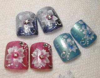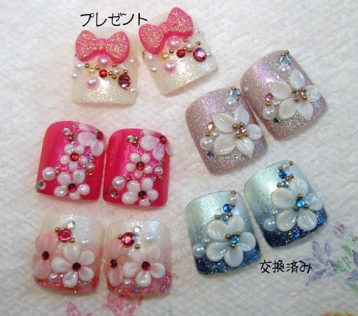 最近私のつかってるハンドピース値上がって・・・ ハンドピースって エアーブラシに使う ピストルみたいなやつね。 ネイル用品全般この4月・5月に大幅な価格改定があった ネイルサロンには、大きいわぁ・・・ ハンドピースの価格改定の価格表が届いたのが 今週だった為 数日前に読んだら、もう値上がった後で えぇ~?(◎_◎) エッ?って感じだったよぉ 値上がる前にハンドピースをもっと買っておけばよかったぁ~(x_x;) それでふと思いついて エアーブラシの練習 夏には浴衣に似合うしね~ ジェルにも埋め込めるんですょ 日曜日で、お姉ちゃんがおばあちゃんとお出掛けしちゃったので 息子君の寝てる間に、マスキング作り(型紙みたいな物) それを使ってみた まだまだ練習が必要・・・ こちら 普段の使ってるチップではない チップを使ったので 品質がB級 交換にオマケ程度に付けちゃう予定こちらは新作のぺディチップで~~すサンプルもいっぱい増えてきました 赤・リボン・トール調レース ・・・・大人可愛い系 ゴールド・黒薔薇 ・・・・ちょいかっこいい綺麗 ピンク・水玉リボン・苺 ・・・・ブリブリ可愛い系 紺・ブルーグラデ・青系薔薇 ・・・・爽やか可愛い系 ピンクグラデ・薔薇 ・・・・大人め綺麗系ハードル低い物ばっかりなので、“ヘ( ̄∇ ̄ )カモォーン♪交換会場