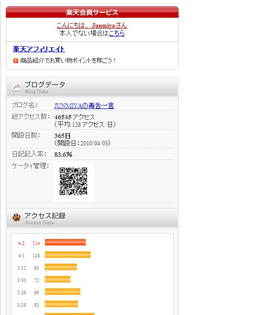 こんばんは今日、ブログ開設から一年経ちました。ここまで日記をつけられたのは、生まれて初めてですね。近頃は更新が無いときもありまして、100アクセスに届かない日もありましたがアクセスを求めているわけではないので、ただ淡々と日記をつけてきました。今後も、つまらない記事が多いと思いますが、お付き合い頂けますとうれしい限りです。これ以上、日記記入率が下がらないよう、努力いたします。このブログを始めた理由は、うつ病で倒れて約一年が経ち、何か目標がほしくて始めました。また、カメラに興味があったので、拙いながらもアップしてきた次第です。そのほかにも車が大好きなので、愛車自慢をしたりとほとんど一貫性がない日記となっていますが、これからも変わらないと思います。この日記をつけてから約半年後に再就職し、現在に至っています。当初は仕事を始めたら、ブログはやめようかと考えていましたが、なんやかんや励みになっているので続けてこられました。明日からは2年目に突入です。来年の今日、10万アクセス行っているとうれしいですね。ではでは。