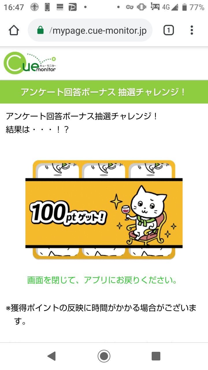 おはようございます 昨日、キューモニターのくじで、初めての100ポイントを取りました。 驚きました。