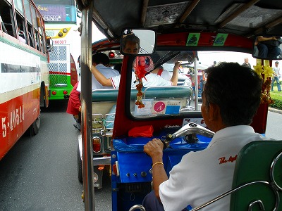 バンコク日帰り観光ネタの続きです。ワット・ポーを見てから、こちらも定番の王宮へ行きます。歩くと少々距離があるので、みんなでタイ名物のトゥクトゥクに乗る事にしました~~~この乗り物、隙間さえあればどんどん頭を突っ込んでいって順番もマナーもクソもありません。(^^ゞ早いのが売りのトゥクトゥクですから、渋滞してれば対向車線まで走っちゃいます。(笑)仕事仲間のタイ人の通訳さんが値段を聞くので、思ったよりも吹っ掛けられません♪80Bだって言うところを70Bに値切ってもらいました。(笑)外国人観光客は平気で300Bくらい取られます。ご注意下さい。ちなみに、普通にタクシーに乗れば45Bくらいで済む距離です。アンタライ(タイ語で危ない)なトゥクトゥクに乗ってる動画↓ ↓ ↓ ↓ ↓ハチャメチャなトゥクトゥクの走りっぷり1posted by (C)JUNSAハチャメチャなトゥクトゥクの走りっぷり2posted by (C)JUNSAお昼になったので食事を食べたいな~と思いきや、この周辺は食事する良いお店がありません。(^^ゞそうしたら「新しいカフェがあるよ♪」と通訳さんが言います。王宮入り口の道路を挟んだ目の前に、まだガイドブックにも紹介されていない超お洒落なお店がありました。au bon painというカフェです。どうですか!!王宮前でこんなお洒落な店は皆無ですよ!!物凄いボリュームのあるサンドイッチ。メニューの写真で想像してた量の倍以上でした。(^^ゞ失敗した~~~!!たのみ過ぎた~~~!!でも全部食べちゃいます。(笑)王宮周辺はボッタクリが当たり前なので、こんなお洒落な店だからこその大出費を覚悟してたら思ったほど高くありませんでした。これ全部(2人前はあるな・笑)で330Bです。こいつは良い店だ~~~。お腹が膨れて、いよいよ王宮へ入ります。王宮へ入るには服装に要注意です。半ズボン・肩の出た服・サンダル履きこれらの服では入れません。ワット・プラケオ(エメラルド寺院)と王宮の様子は次の日記で♪JUNSA@タイ王国チョンブリの田舎ホテル