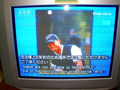 テレビ大好きで自宅に居る時はいつもテレビがついてる生活をしているJUNSA。もちろんタイでもテレビが見たい♪だけど当然、タイではタイ語のテレビしかやってません。パサ・タイ(タイ語)はマイ・カウジャイ(わからない)です。(笑)そんな中でも唯一見れるのがNHK。NHKなら日本語です!!日本では見ないのに、NHKてれび小説「つばさ」を毎日見てます。(笑)ただね。日本で放送してるNHKとはまた、ちょっと違うのですよ。世界に散らばる日本人向けに衛星で飛ばしてる専用放送。サッカー日本代表や大リーグやアメリカのゴルフなんかのニュース報道は放送権が日本に限ってるので、こんな静止画に切り替わります。(T_T)海外でNHK見る人にはお馴染みですよね~~~時折、タイの番組でもタイ語に吹き返られた日本の放送もやってます。特にアニメが多くて、先日ガンダム00シーズン1やってました。声優さんの声が全然違うのでかえって新鮮です♪(笑)JUNSA@タイ王国チョンブリ県の田舎アマタナコン工業団地外れのホテル