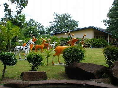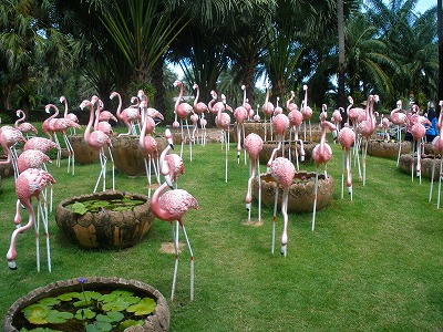 パタヤ日帰り観光の続きです。次に行ったのはノン・ノッチ・トロピカル・ボタニカルガーデン&リゾートという場所。地図を渡されてもココが何なのかさっぱり分かりません。(^^ゞかなり広大な土地です。宿泊施設もあって、確かにリゾートだ。駐車場で車を降りると・・・ケモノ臭い・・・きっと動物園だわな、こりゃ。(笑)でも、タイで動物園なんて見た事無い。(^^ゞいったい、どんな動物が居るんだろう???作り物のフラミンゴの群れ。その量がハンパじゃない!写真に納まり切らない量があと3倍くらい。作り物だけど尋常じゃ無いこの物量。なんか、ここ、凄い所だぞ!?これも作り物かと思ったら動いてるじゃん!!この子、うちにも居るぞ!!これ、生きてるぞ!!(笑)↓ ↓ ↓ ↓ ↓うちにもいるぞ、この子達♪(笑) posted by (C)JUNSAデッカイ、トラが居ました。このトラ、日本じゃ考えられない状況で飼われてます。首輪にチェーンのみ!!人との間に柵も堀も何も無い!!大迫力でしょ~~~。触れるんですよ、トラが・・・(^^ゞ危ない、危ない!!広場に何故かロータスが置いてありました。ポーズを取ってる綺麗な女の子が居て、皆こぞって写真撮ってたのですが、この子、素人でした。(笑)タイの人は老若男女、写真を撮る時にほとんどの人がポーズを付けます。それが上手なんですよ。この子も上手でしょ~~~?で、このロータスもイベント展示ではなく、個人所有の車でした。いったい何だったんだ~~~???水族館風の水槽展示もありました。↓ ↓ ↓ ↓ ↓タイの水槽に入ってるお魚達 posted by (C)JUNSAお!!タイらしく象さんがいるぞ!!しかも、とてもたくさん居るのですよ。近い!!象さんに触れるぞ~~~♪♪↓ ↓ ↓ ↓ ↓タイの近すぎる象さん達 posted by (C)JUNSAやけに沢山いるな~~~と思ってたら、この象さん達、物凄い子達でした。日本のテレビで見た事ある!!そんな凄い象さんネタの紹介はまた後日。JUNSA@タイ王国チョンブリ県アマタナコン工業団地外れの田舎サービスアパートメント