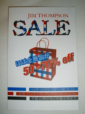 お休みだった日曜日、タイのブランド品であるジムトンプソンのセールに行ってきました。お土産品の定番なのですが、タイの物価と比較すると、とても高いブランド!それだけにセール開催は、とてもありがたい企画です。先週、伊勢丹の店舗でもらった案内葉書には思い切り日本語が書かれてる。(^^ゞメインの顧客が日本人だって事がよく分かりました。アマタナコンのホテルからプロンポンまでちょうど1時間で車移動。そこからBTSでオンヌットへ行きます。会場は通常の店舗ではなく、大きなホールなのです。スワンナプーム空港方面の出口を降りるとシャトルバス乗り場への看板が貼ってありました。バスは30分に1本出てるみたいでした。最終日のしかも10時開場に対して10:30頃だったのでシャトルバスはガラガラ。こりゃ、いいや~~~多くの人が居ましたが、結構広い会場なのでとても空いてました。もっと混んでるかと思ってただけに、のんびり選ぶ事が出来て良かったです。入り口で手持ちのカバンに万引き防止のビニール袋を被せられます。その袋とは別に、欲しい物を入れる大きな袋を渡されいざ会場に突入!!一緒に行ったメンバー3人と1時間後の待ち合わせを決めて、はじから全部見て回りました。品揃えは超豊富!!居れば居るほどたくさん買ってしまうでしょうね~(^^ゞレジの前に大きなスペースが設けられててそこで袋の中を整理できます。要らない物があったらキャンセルできるワケです。で、JUNSAが買ったのは、家族・親族・自分にTシャツ。子供達に小物。4150バーツ、約1万2千円分も買ってしまいました。(^^ゞでも、定価で買ったら物凄く高くなっちゃうだけに、お買い得感抜群です!!大きな袋2個分お買い上げです。おみやげなので、どんな物を買ったかは内緒にしますね♪セールの後、みんなで食事に行きました。以前バンコクへ来ていた時によく行ったピザ屋さんへ行きます。ここのピザ、大好きなんですよ~~~!!薄生地のピザを大量に食べました~~~!!BTSナナ駅から歩いて10分かからないくらいの所にあります。あまり美味しくて、ピザの写真撮るの忘れちゃいました~~~(笑)こんな日曜日を過ごしたJUNSAなのでした。さ。今日からまた一週間お仕事だ。頑張ろう~~~!!!JUNSA@タイ王国アマタナコンのホテル