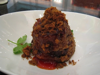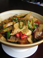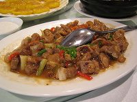 友人と3人で中華でランチ場所は天河北路にある時代広場の西側のビル・韓風国際大酒店2階にある「湘西苗砦」ランチといっても2時過ぎに訪れたので,店内には客はダレもいなかった。お店のお兄さんやお姉さんたちもほとんど休憩タイム。 休憩中失礼しました。メニューには大きな写真が掲載されているのでわかりやすい。↓は豆腐売り場でよく見かける茶色の薄い豆腐,唐辛子と豚肉の炒め物。豆腐はちょうどいい固さ。食堂のような店だととても塩からいものがサーブされるが,これはいい塩梅。野生キノコと豚肉の炒め物。キノコはなかなかいい味をしていました。豚肉は2種類使用しているようで塩からいベーコンのような豚肉と脂身がたっぷりの豚肉。これはめちゃくちゃ塩からい。ご飯がすすみました。後ろの1品はかぼちゃペーストを揚げた甘いデザート。モチモチして甘い。1皿12個ですが6個でもオーダーできるこれは白菜とニンニクと春雨の蒸したもの。以前キッチンマーケットで紹介したものと同じ料理。元貝の清蒸と同じ味付け。3人でお茶,ご飯とこれらの料理を食べて70元(約1,000円)。安いですねぇ・・・ビュッフェスタイルのランチがありましたが,時間切れ。ビュッフェは20元/1人。パンフレットを見るとなかなか美味しそう,次回はビュッフェをトライしたい。地球の歩き方(D 05(2007~2008年)