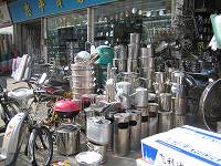 日曜日に,最近発見したキッチンマーケットへ行ってきました。今回は,相方がゴルフの練習をしている時間に私が探索するという理想的な時間配分。管理人一人でたっぷり見学することができました。前回「大石沙渓国際酒店用品城」を訪れたときは,時間制限があったので消化不良気分だったので,今回はゆっくり探検してみたかった。このマーケットの道をはさんだ向かい側にも「日用品」関連の市場があり,↓の写真のような金物系,プラスティック系,台所用品系,文具系と巨大な市場だったのだ。面白ものでは,ベビーバス,中国風の巨大な壷,スリッパ,炊飯器・・・・・etc.それに加えて,この日用品の近くにはお茶市場もある。このお茶市場は出来たばかりのようで,すでに巨大なモールになってはいるが,空き店舗がまだまだあった。今回購入したのは↓の鍋しき(1元/1枚)と徳利(15元)とおちょこ(各2元)管理人は相方が来るまで2時間半も一人でブラブラしたのであった。(笑)このマーケットには「江南漁米香」というレストランがあったので,相方と二人でこの店でランチ焼き茄子,チャーハン,肉砕蝦干蒸津白 二人で食べても50元足らず。焼き茄子も炒飯も若干薄めの味付け。最後に来た白菜料理も期待していなかったが,これはおすすめ。本来肉の代わりに蝦がかけてあるのだが,今回は蝦をきらしていたため豚肉の細切れがかけられていた。肉でなく蝦だったらもっといい味になっていたかもしれない。白菜を口にほうり込むと,ニンニクのいい香りがツーンと鼻まで香りがし食欲をそそる。この料理は程よい塩加減。どこかで食べたことのある味付けと思ったら,これは元貝のニンニク蒸料理と同じ味付け!レストランの入り口には,魚介類の水槽,鳥のケージがあったので,魚介類や鳥系の料理のほうが美味しいかもしれない。レストランは小奇麗,外国人も多いようで,英語を話す小姐がいた。