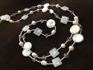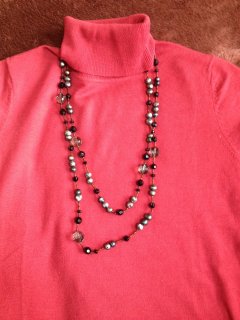 渋いガンメタルに近い淡水パール、ブラックのグラスビーズ、スモーキークォーツのようなグラスビーズ。それらのビーズの間に渋いダークゴールドのシードビーズを使用。茜色のセーターに渋い系のロングネックレスがひきたつ渋いゴールド系のニットにもそろそろ春色のネックレスの準備が必要かな・・・上品な輝きが大人気のクリスタルビーズネックレスが新入荷!!ジャラジャラとしたロングシルエッ...