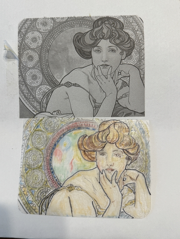 プラ板でブローチ作りアールヌーボー風からのミュシャの模写元の絵は縦10センチくらいの大きさバックの背景が細かくていい加減になってます( ;∀;)水彩色鉛筆で彩色し、筆で水彩画風にしています縮小するとどんな色になるかわからない。↑顔の色がまだらになってしまうバックの円の中はイメージ通り 縦は4センチになるこの絵は太いアウトラインと細いアウトラインを使いわけているのでその通りにするとお遠目ではミュシャっぽくなるレジンをかけるときれいに仕上がります↑縮小率がうまくいかなかったため顔が男性っぽくなってしまった。裏にフェルトを貼り周りをビーズで刺繍 本物の石かパールを使ったほうがいいと思うが今は練習中なので、もう少しいいものが出来るようになったら本物を使いたい(いつのことやら・・)これも縦横4センチ足らずなので、ぱっと見は一番納得できるものとなる凝ったビーズ装飾をしたいけれど・・・思案中ミュシャの模倣はトレースとはいえ1日1個で力尽きる↑コザクラインコは来月会う友人へのプレゼント。まだ試作中・・・プラ板遊びはまだまだ続く~~~
