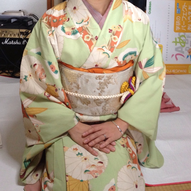 今日は毎月最終金曜日恒例の着付けの会の日でした。ヤフオクで落とした正絹の着物2000円+名古屋帯2000円=4000円のプチプラコーディネイト★★横からも☆☆名古屋帯は、ちょっとしみがあるんだけどアンティーク柄が私好み♪着物は、黒だとずっと思い込んでいたら、深い緑だということに今日、気づく。少しずつ着物を自分で着れるようになって、楽しくなってきた今日この頃。また来月の着付けの会も楽しみだわ!