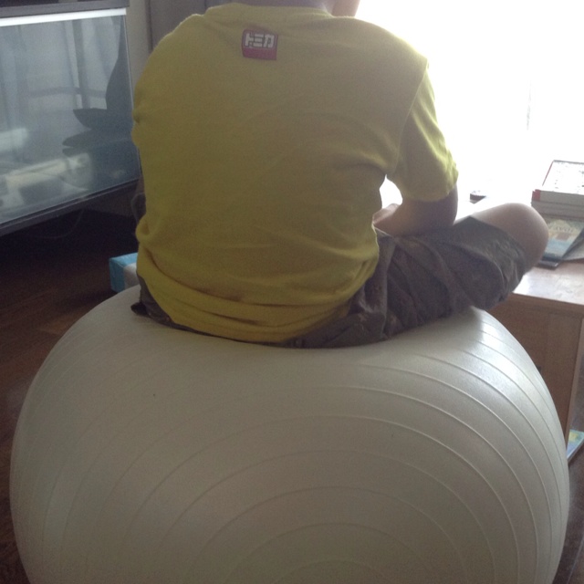 台風が接近しています。 突然雨が降ったかと思えば、晴れたりおかしな天気。 そんなわけで、自宅にこもり、我が家の少年と一緒に、DVD三昧です。 バランスボールにのりながら、DVDを見る我が家の少年。