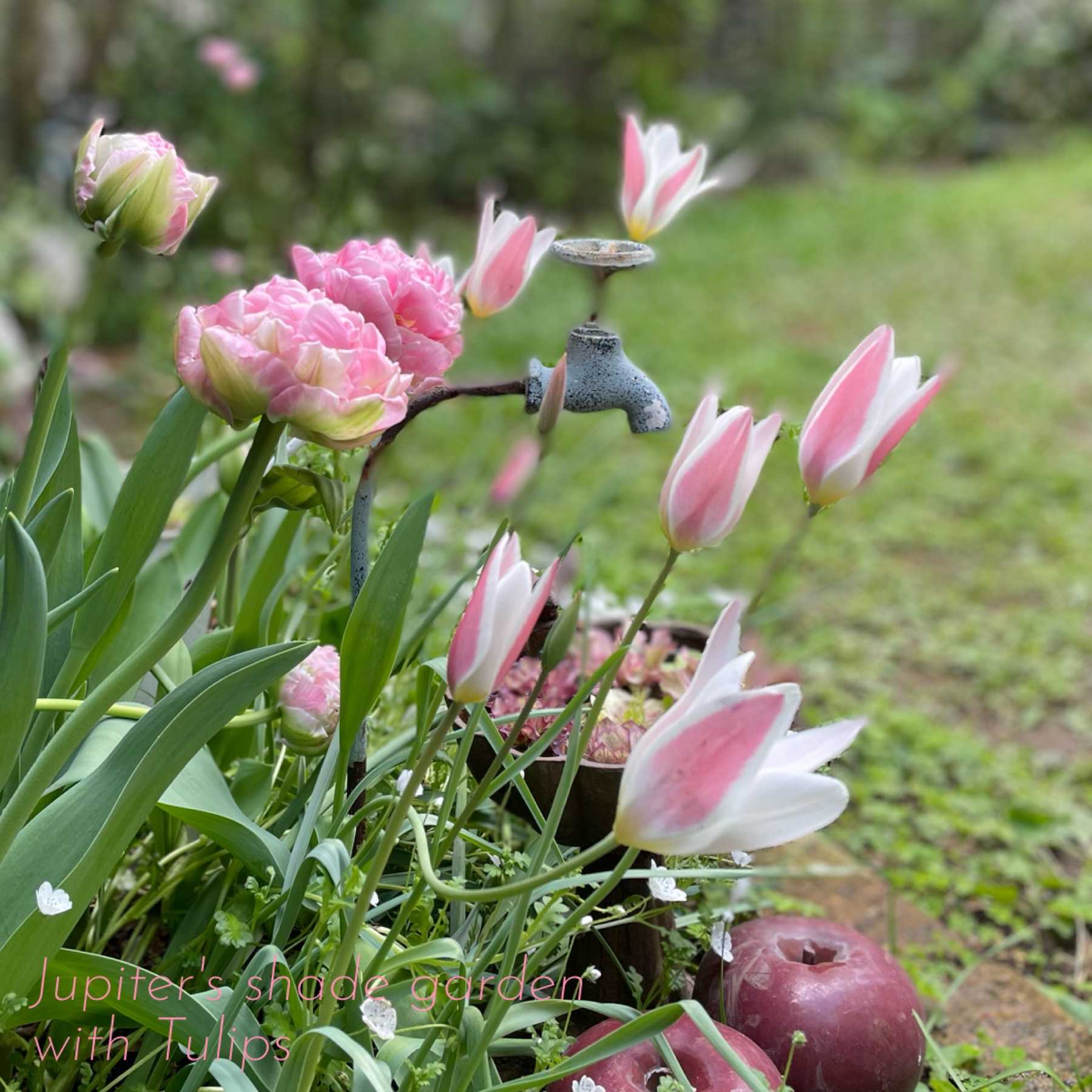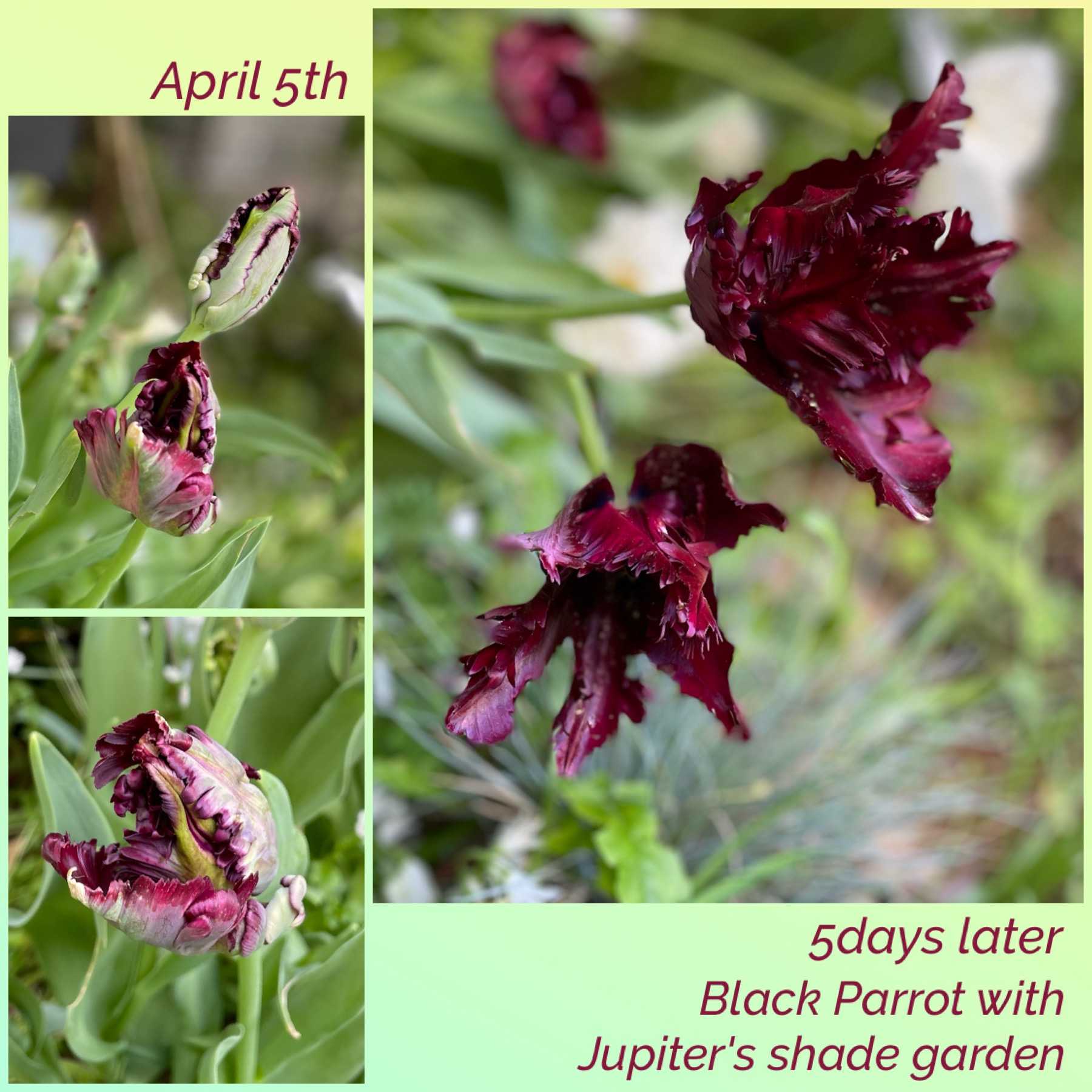 ブラックパーロットの変遷をコラージュしてみました。咲き始めの姿が、ほんと怖い。球根に注意書きが必要じゃないかと思う。さて。このチューリップに気を取られている間に、他のチューリップも咲き始めました。こちらはミステリーバレー。房咲きのような、変わった咲き方です。この角度から見ると、段になって咲いているようにも見えます。なんでしょうね。この咲き方。この先、どうなるのか興味津々です。新種のチューリップセットとして、国華園でお迎えしたうちの一つです。二つ目はこちらのダブルサプライズ。アイスクリームという種類がありますが、そのピンクバージョンのような花です。中央のクリーム部分が美味しそう。その奥に見えるのが、ダブルシェイク。ネモフィラが良い仕事をしてます。こちらは新種ではないマウントタコマ。マウントタマゴと覚え間違いしちゃうほどタマゴのような形です。終わりかけのレディジェーンとクリスマスローズのフローティングフラワー。クリスマスローズより寿命の短いチューリップ。働いている私にしてみれば、綺麗なのはほんの一瞬。たくさん綺麗な瞬間を切り取っておきたいですね。