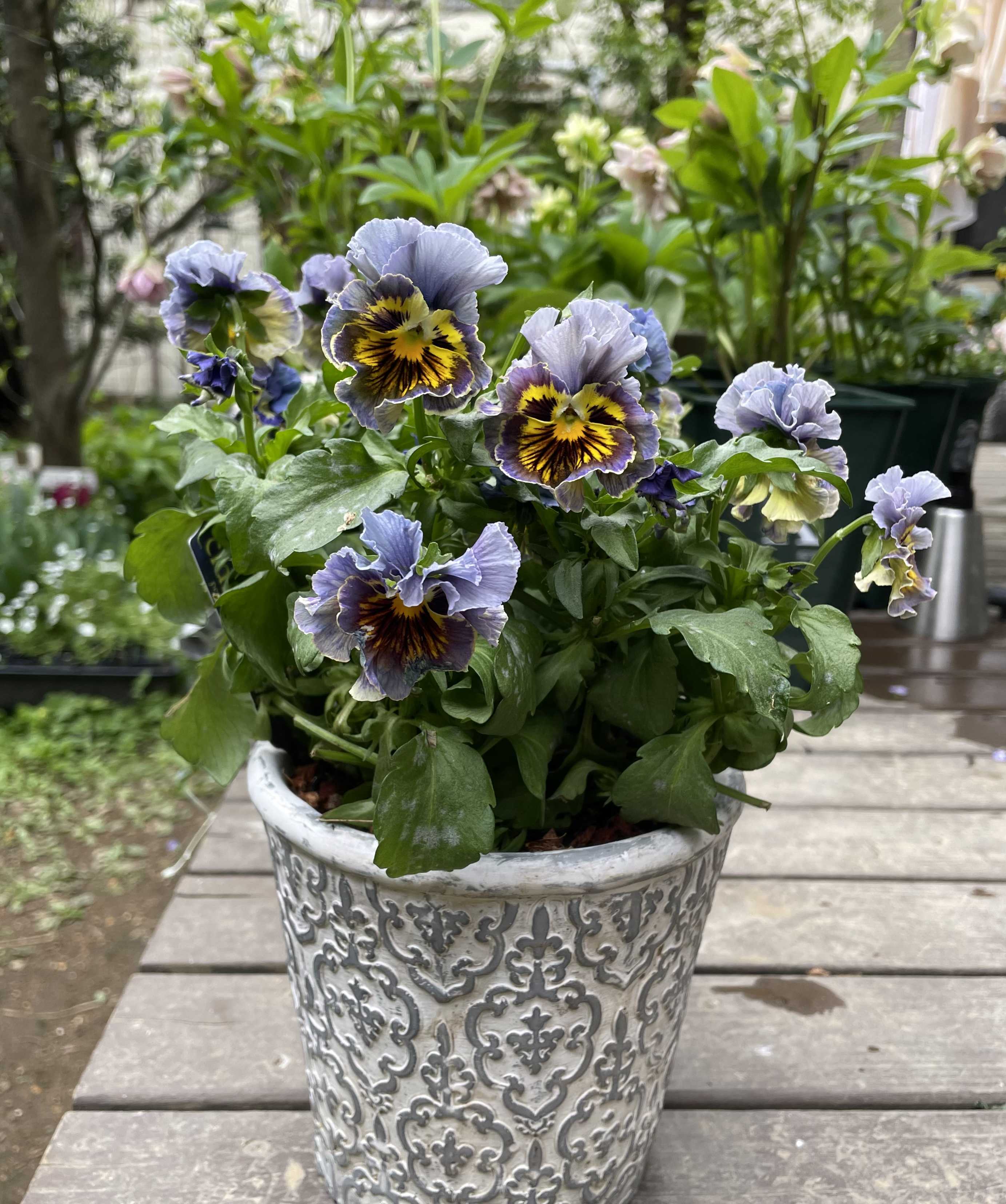 レディジェーンとダブルシェイクのコラボレーション。ダブルサプライズかと思ったら、シェイクの方でした。多分…こんなに綺麗な状態はあまり長く持ちません。一度雨でも降ったら、八重のチューリップは水を溜め込んで、頭が下がってしまうか、倒れ込んでしまいます。何とか少しでも長くそこにいて欲しい。見元園芸のビオラ、Mr.グリニッシュ。まるで画像加工したかのように、白が抜けてます。不思議な色合いだこと。ブルーからブラウンへのグラデーションが特徴的なマシェリマダム。青が滲んでます。玄関ガーデンの小手毬が咲き始めました。清楚な花です。ガーデンテーブルはあふれんばかりのビオラに埋め尽くされています。これ以上咲いたら溢れそう🤣