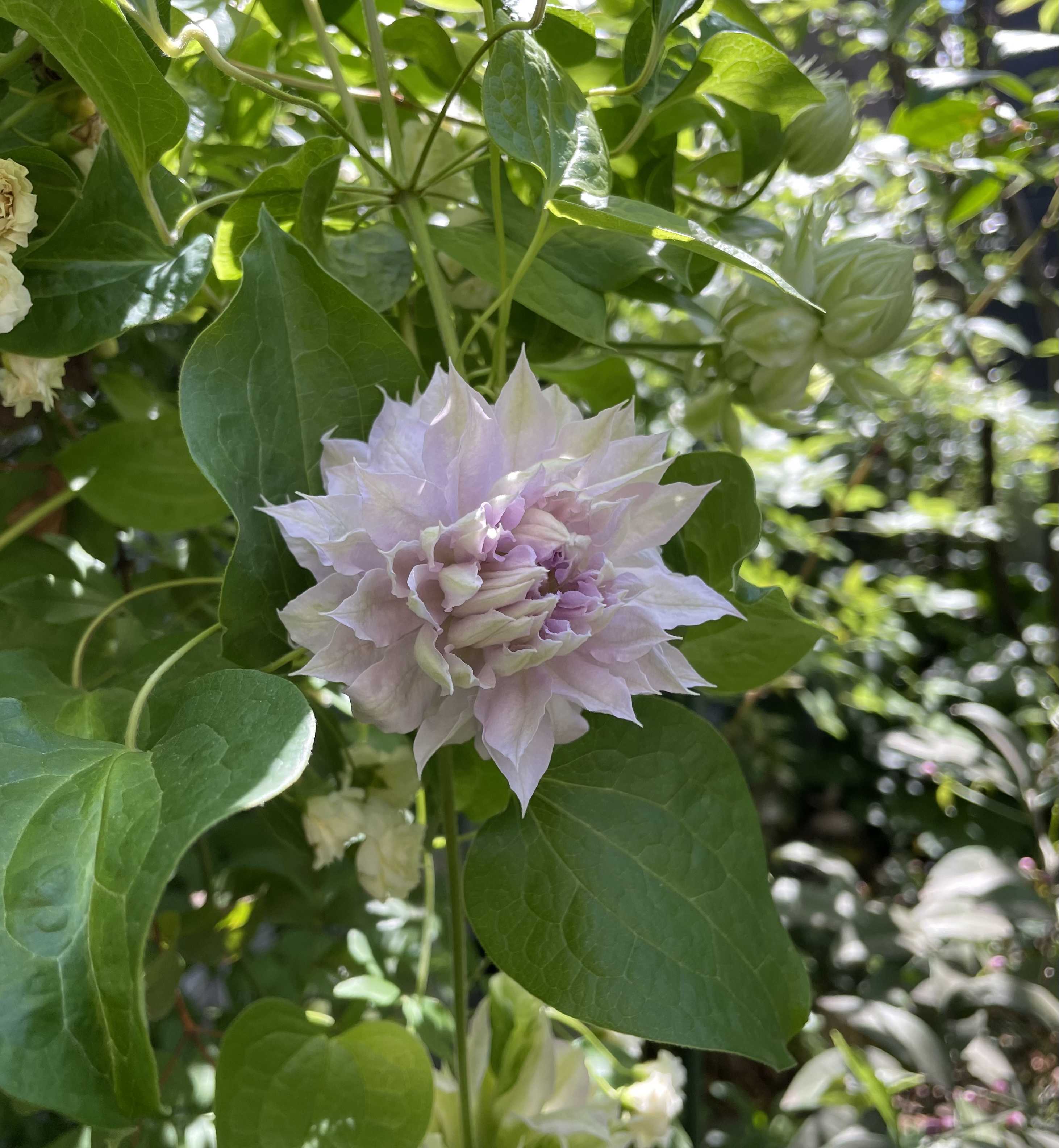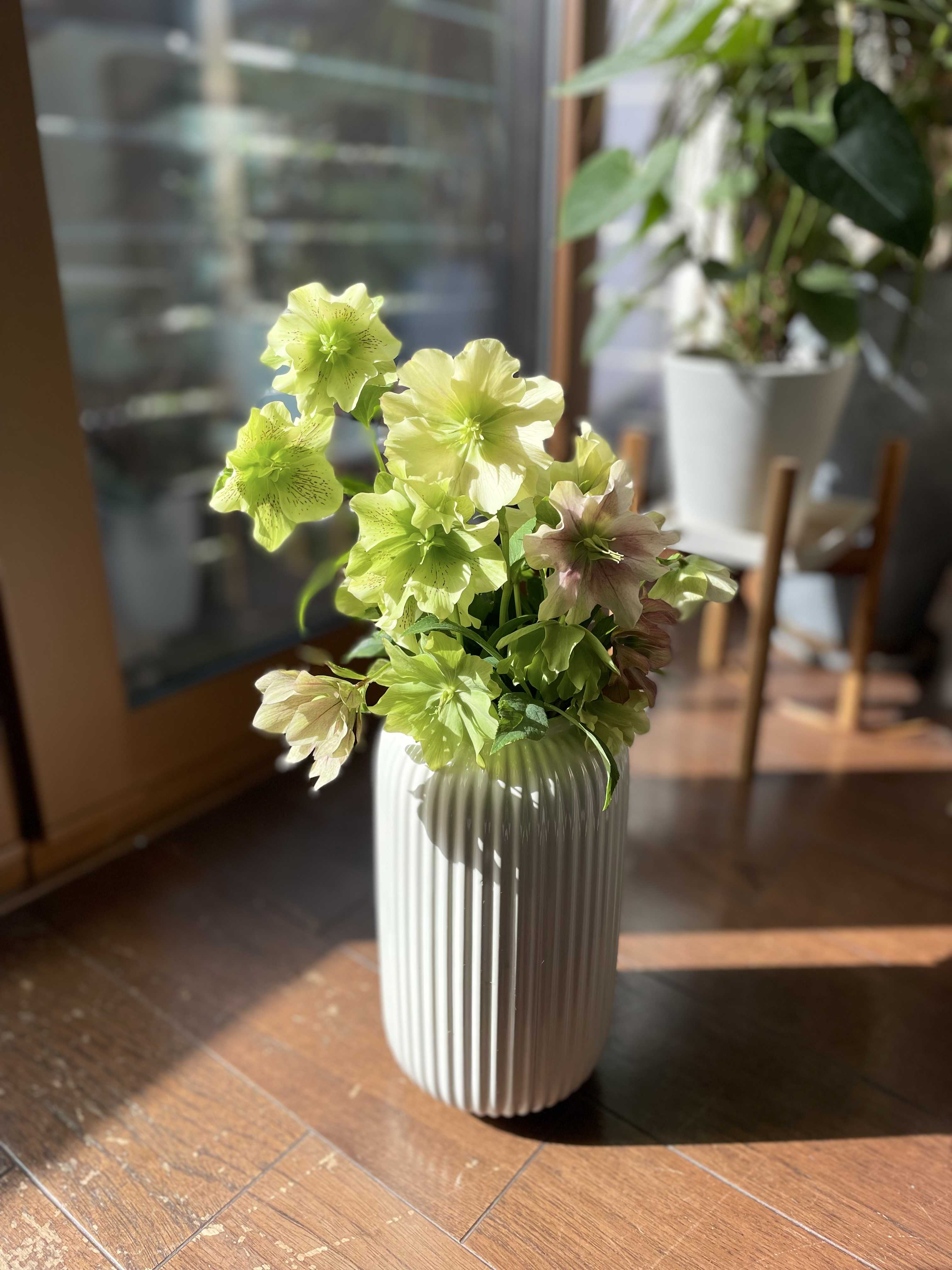 植木屋さんに2日かけて家屋周りの樹木を剪定してもらい、スッキリ。特にこの一年の樹木の伸び具合といったら…シラカシとレモンが病気になっていました。シラカシは煤病。アブラムシの糞害などから発生するそうです。バラやビオラなどに発生するアブラムシが影響したと思われます。ハナミズキもここ2年うどん粉病になっていて、そこから移った可能性もあるとのこと。昨年発生したクリスマスローズのブラックデスも原因がわかりませんでしたが、庭に蔓延るうどん粉苗、煤病のウイルスをアブラムシが媒介したのだ、と目から鱗。 シラカシやレモンなど、思い切って短くカットしてもらい、ちゃんと薬剤を散布しておきました。今年はクリスマスローズやビオラにはオルトランを撒いたので、今のところビオラにはアブラムシ発生なし。ちゃんとしよう、と思いました。いよいよ、温存しておいた花郷園の花たちも子房が膨らみ始めたのでカット。花郷園の子達はみんなステムが長めなので、花瓶に活けました。こちらはカメラのポートレートモードのステージ照明機能を使用。本当に舞台に立ってるみたいなスポットライト効果。すごい!向きを変えてもう一枚。あ〜名残惜しい。今シーズン、ありがとうね。植木屋さんが剪定せずに残してくれたバラ。素敵です。バラアーチに行かず、日向に日向に枝を伸ばしてきます。クレマチス美登利が膨らんできました。ゆっくりゆっくり。ライトグリーンのクレマチスです。ラピスラズリ。濃いめのカラー株。調子の良いドラキュラ。レディはモリモリ盛りを過ぎ、倒れ込み始めました。クレールドリュンヌもちょっと気温が上がるとくた〜っと倒れ込みます。今が盛りのコデマリ。車とポストの間に挟まれてちょっと可哀想。
