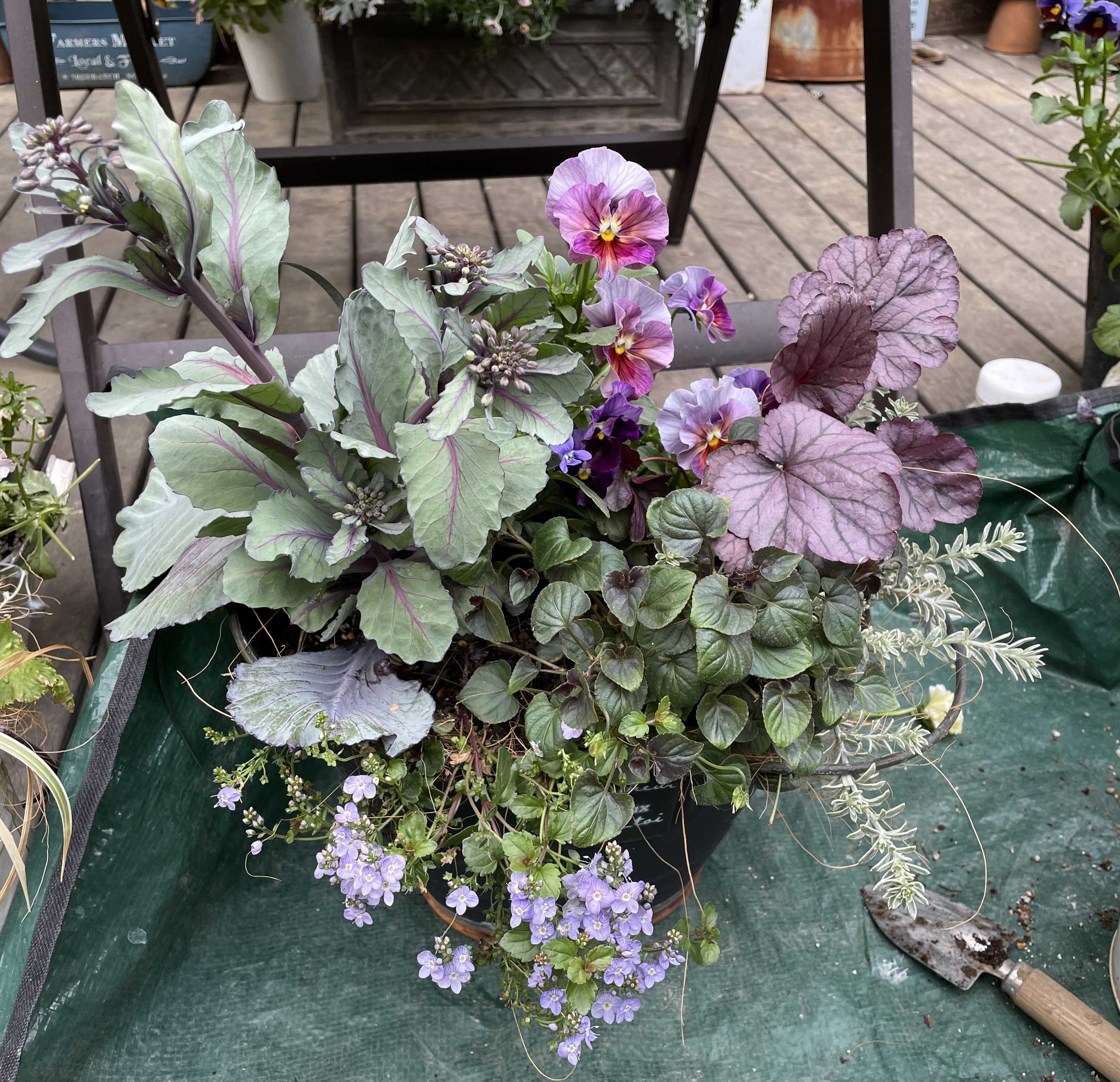 曇り空の休日。空気はひんやりだけど、それが嬉しい。ビオパンやバラが長持ちしてくれるから。ランチに出かける前に撮ったフロントガーデンのラベンダー。ランチの間に娘に見せると、「え〜そんなのうちに咲いてた〜?」こらこら、ど正面に咲いてますがな。帰宅後にこれだよ〜と教えると、ボサボサやん、と。ナチュラルと言って欲しいなあ。ランチを食べたレストランに隣接する花屋で当然お買い上げ。個性的なペチュニアとラベンダー、ディコンドラなど。早速、終わりかけのビオラを植え替えました。このペチュニアは、ドラキュラの代わりにぴったりです。レモンカラーのバーベナはラベンダーと合わせようと購入しましたが、余ったので、ヒューケラとオレガノと寄せ植えました。黒葉の金魚草は待機のまま、咲かせてしまいました。葉牡丹抜いて植えちゃいました。バーガンディーアイスバーグ。日陰でもよく咲いてくれるバラです。本当に元気なシエルブリエ。もう飽き気味だけど、また来シーズンお迎えしちゃうんだろうな。え、もう半年後じゃん!ビオラってなんだかんだで一年のうち半年以上はうちにいるってことですね。10月〜11月にお迎えして4月、5月まで。改めてすご〜い。アンティークのカラーのラピスラズリ。膝の上に座って私をロックするぷち。お仕事させてよ💦可愛いんだけどね。