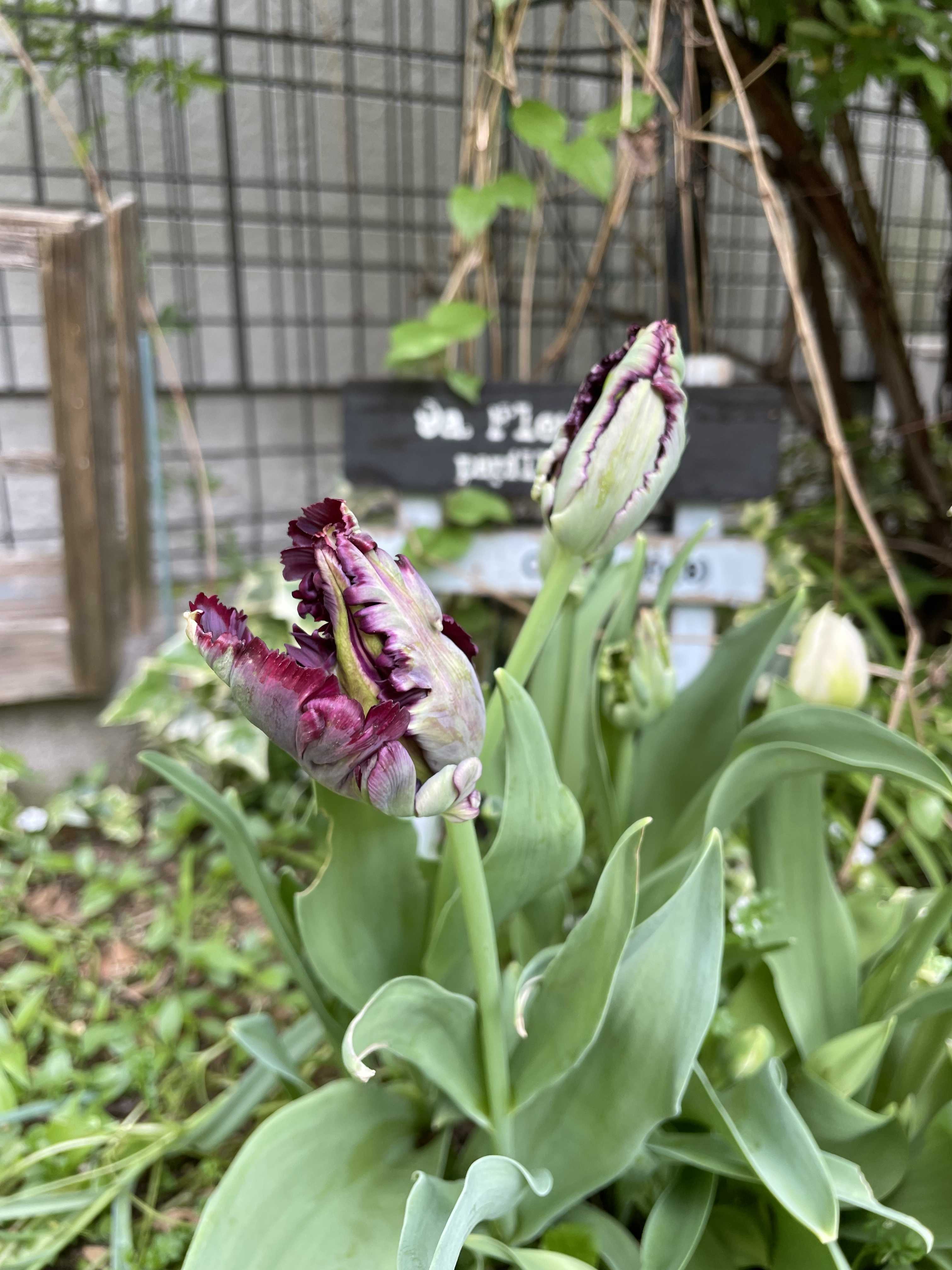 先日、我が家の庭に現れた怪獣。私はチェンソーマンと呼んでいましたが、SNSに投稿したところ、マリオのパックンフラワーとか、ロブスターのハサミとか、色々とコメントをもらいました。なるほどなあ、と納得。そして今朝のチェンソーマン。あれ。普通のチューリップになってない?ほっとしたような、残念なような🤣単に咲くまでの過程だったってことで。にしてもこのメタリックカラー、車みたい。ナンバーつけて走らすか。ローダンセマムの寄せ植えが陽当たり悪くくねくねに。ウッドデッキの奥から手前の日当たり良い場所に引っ張り出しました。これはこれでナチュラルで良いですけどね。切り取ったらかわゆい😍マシェリマダムの不思議カラー。ベージュとパープルのグラデーション。ロカハーツの柔らかいベージュはまた違った雰囲気。これも独特カラーのビオラです。大好きなラダーシェルフコーナー。お気に入りの雑貨ばかり集めてます。こちらは近所の銀杏の新葉。若葉ってこんな綺麗なグリーンなんですね💕