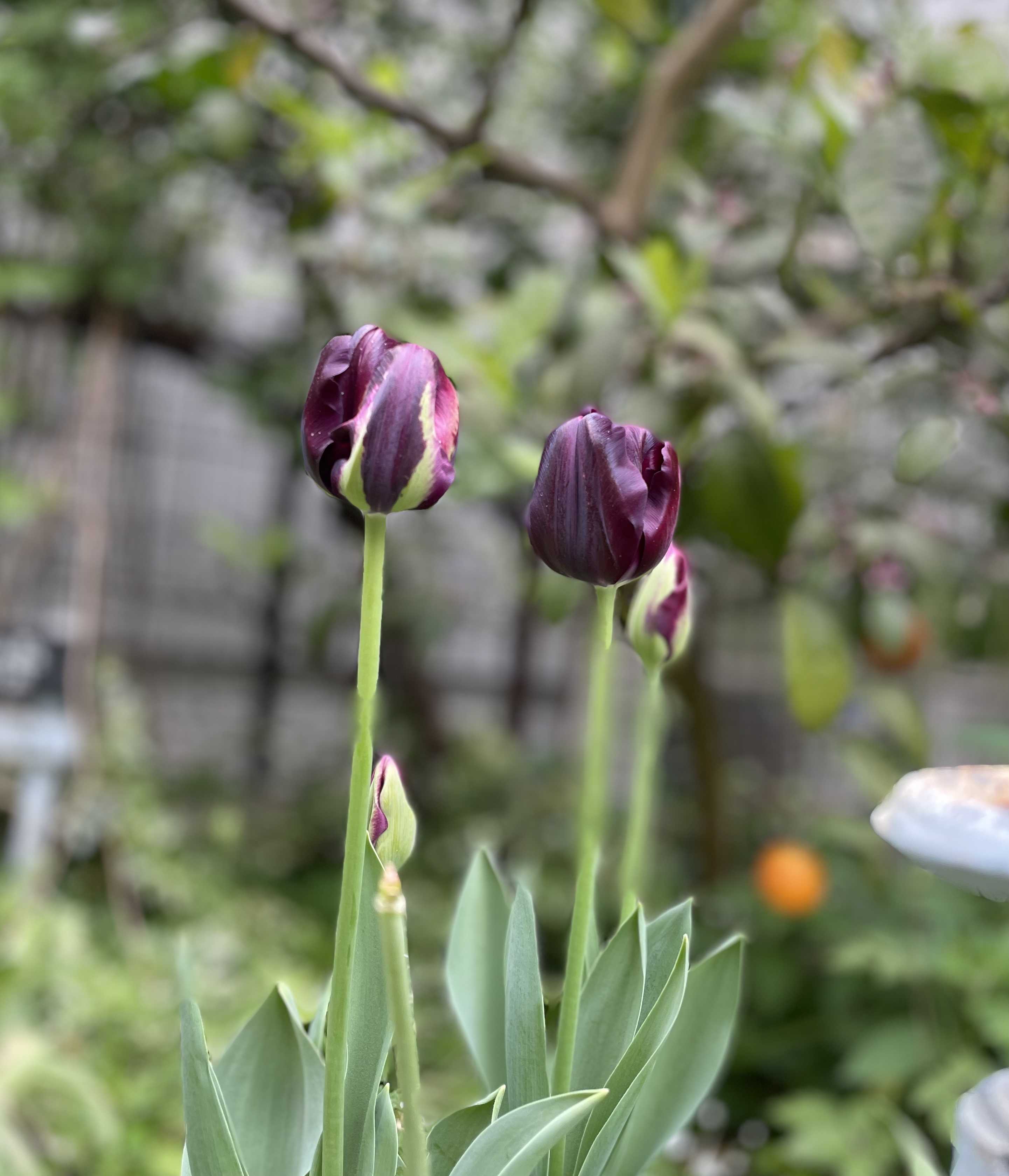 遅咲きのチューリップ、カフェノワールが咲きました。このブラックカラー、やっぱり好きだなあ。毎年購入していたお花屋さんが、この球根を買った後、閉店してしまいました。来年からはどこで買おうか…ベルオブウォーキングの開花。今年は綺麗に咲けましたね〜葉が揃ってきたホスタの様子も撮っておきます。この時期が生き生きとして一番綺麗。これから花が咲いてきます。毎朝チャレンジ。この組み合わせ、なかなか素敵。黒葉クローバーがピンとしてきました。アンティークな雰囲気です。八重咲きのバコパ。出勤前の時間で花殻を摘みました。ワンコインまで値下がりしたところを救済したマシェリマダムはここ最近、本領を発揮してきました。全体がベージュ色の子。ベージュからパープルにグラデーションの子。パープルのスジスジがはっきり出てる子。んんん!これはブルーのスジスジがとっても綺麗〜大器晩成型ですね、このビオラ。気に入ったので、前面でクローズアップ。背景にジョーロなんて置いちゃったりして。こんもりまるく咲くより、こんな感じのナチュラルな咲き加減が好きです。朝起きたらリビングソファの上に3匹固まってました。ちょっと寒かったからね。仲良し女子会だね。