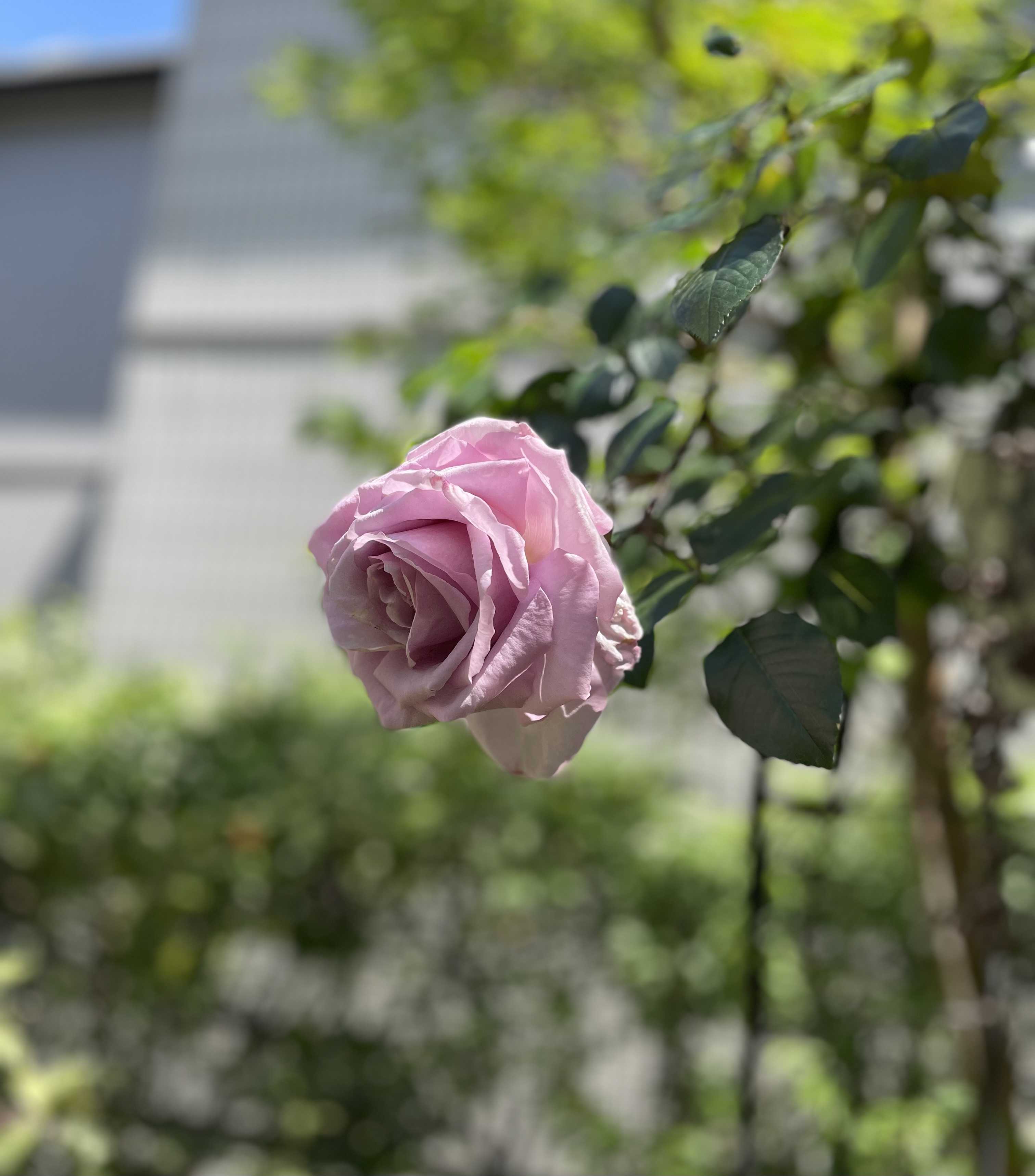 ローズシネルジックが咲いてきました。(今はシナクティフと呼ぶらしいです。)バラは5月という概念がありますが、今は4月になると咲いてきますね。桜は3月には散ってしまうし。冬がどんどん短くなって、春が早まり、夏がどんどん暑く、そして長くなってきてます。熱帯化が進み、樹木も葉っぱも巨大化してきている、と植木屋さんが言ってました。背伸びをして、腕を伸ばしてバラの顔を捉えたい…実は、今日、植木屋さんに庭木の剪定をしていただくにあたり、このバラの蕾を剪定することに。周りの樹木に巻き付いてしまっているので、泣く泣く了承しました。カットした蕾は取っておいていただく約束で。年中、返り咲くバラなので大丈夫。きっとすぐに咲いてくれるはず。名残惜しくて、せめてもと写真をいっぱい撮りました。青空にピンクのバラが映えますね。シンボルツリーのハナミズキの全貌です。こちらも剪定していただくので、この姿は今日で見納め。晴れて良かった〜2階から見下ろすとこんな感じです。結局、ローズシネルジックは、一部の枝をカットしたのみで、蕾もお花も残していただけました。感傷的になりすぎましたね🤣