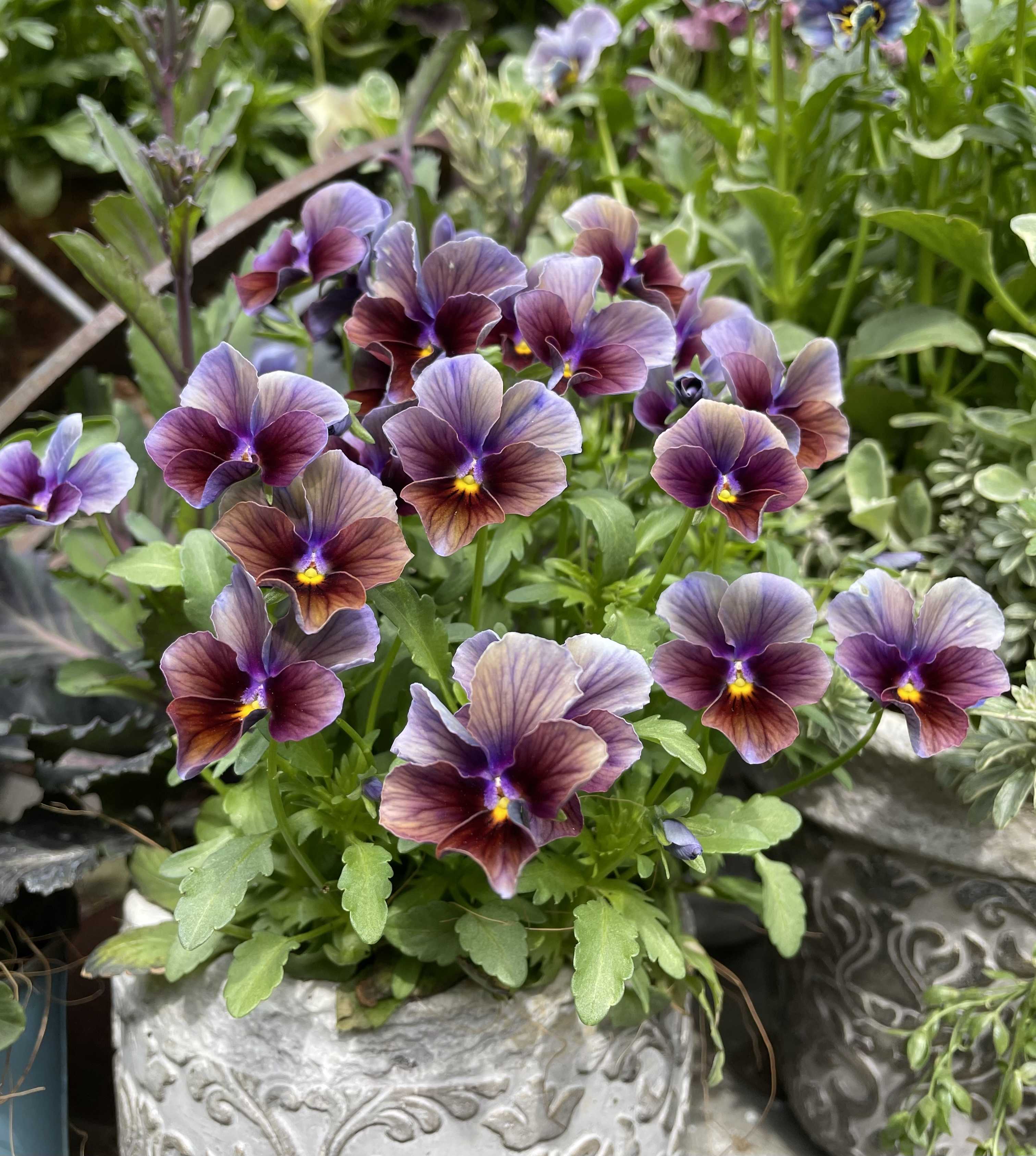ベルオブウォーキングの開花が進みます。午前と午後でもその違いがはっきり。あっという間に見頃が終わってしまう…ブラックベリーの花も始まりました。ビオパンの様子です。まずレディ。カゴの中にぎゅうぎゅう状態。こうなるともう出すに出せない状況です。出さないけど。結局ボジョレーはほんの一時花を切らしたぐらいで、シーズンの間、ずーっと咲いててくれました。花色は寒い時がブルー寄り。気温が上がるとブラウン寄り。徒長もせず、倒れもせず、優秀だわ〜ミスターグリーニッシュも。この子は少し途切れた期間が長かったけど、この独特のカラーリングと、モリモリ度合いがすごい。鉢よりもかなり前に迫り出してきてます…今年、パンジーの調子が今ひとつ。来年は寄せ植えにするの、やめた。ちょこっと植えでいこう。比較的調子の良い赤ドラ。ん?今見ると赤でなくパープルか?すぐに水切れして、ぐったりする小輪のヌーヴェルとクレールドリュンヌはガーデンテーブルの北側に配置しました。少し西陽が回りますが、ここならガンガンの太陽光からも逃れられ快適な様子。まだまだビオラを諦めませんよ〜