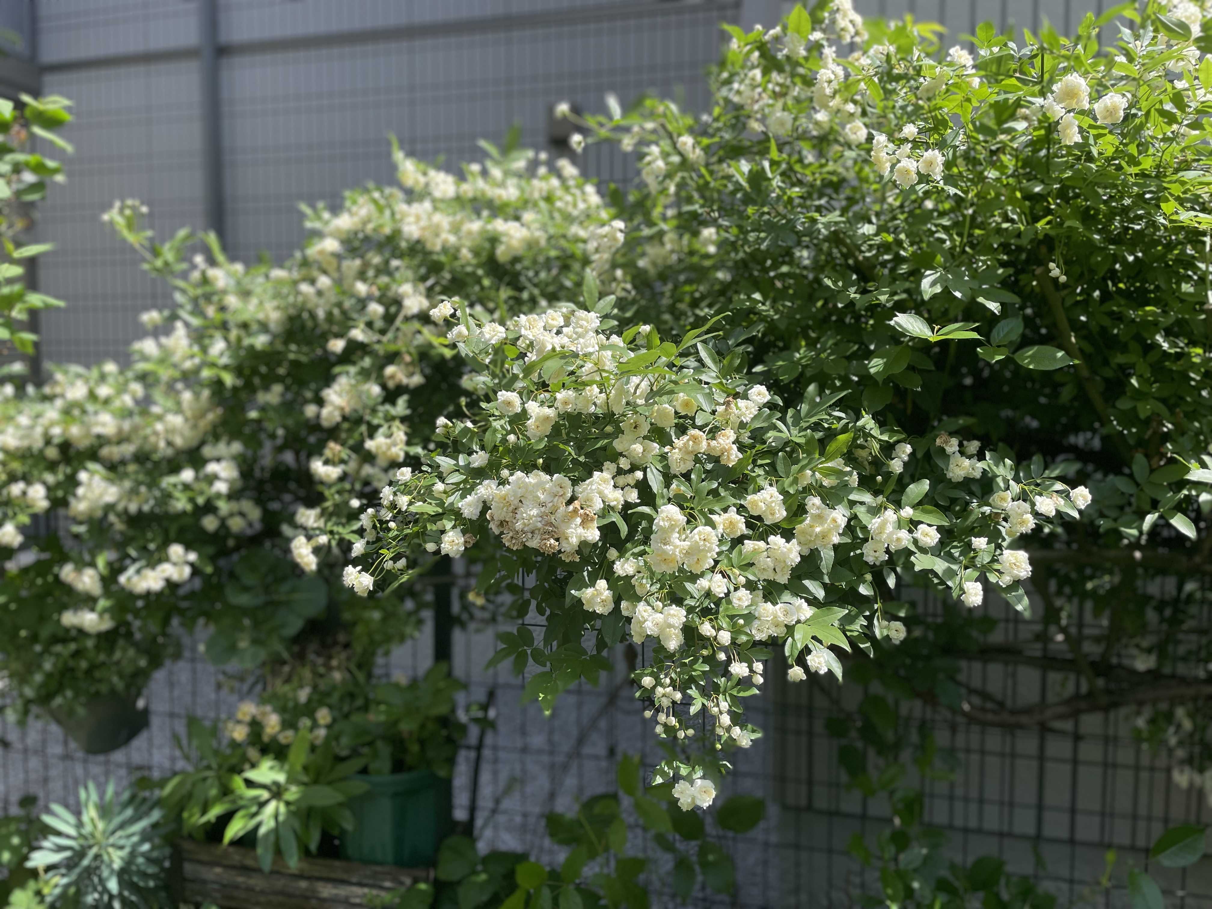 スッキリ晴れた日曜日。雨上がりですが、急速に湿度は下がり、風が心地よいです。雨で首を垂れたローズシネルジックが復活してきました。花を近づけると、ほんのりブルーローズの香り。ビオラパンジーがくたくたになっているのをテグスで起こしたり、土増ししたり。なんとか温存しようと手を加えてます。手前のドラキュラは株周りにテグスを巻いて、中央に寄せてます。ボジョレーはブラウンが強くなってきました。気温が高く、撒いた水が水蒸気になって上がっています。なかなか頑張るレディ。鳥籠がギュウギュウです。ラピスラズリは健在。大きな鉢に植えたから水切れしにくいのでしょうか?他の植物たちとどっちゃり寄せ植えなので、お互いを支え合ってるのかも。ローダンセマムのプチマカロン。陽当たり良いところに移したら、この通り、花首がしっかりしてきました。やっぱり陽当たり大事。家屋の東側フェンスを占拠するモッコウバラ。満開です。自然のバラアーチ。この通路、ほとんど道ゆく人々からも見えない位置にあり、一番楽しんでもらえるのは隣のマンションの住人の人かな。我が家の家族も誰も関心がないようで…さあ、バラアーチを抜けた先の足元に、零れ種で増えた立浪草のパープル。同居していてドクダミ草は抜きました💦反対側には白の立浪草。もっともっと増えてほしい。ブリキ缶で育つのはピンク。こういう穂状の花が好きです😍最近、花屋行きを自粛しているので、庭時間がゆっくりです。ビオラパンジー、寄せ植えたちのメンテナンスに時間をかけられて大満足です。
