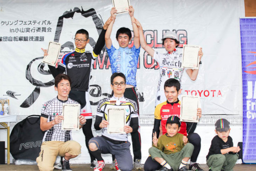 JBCF 乗鞍スカイラインヒルクライム NO2結果:エリート1(E1) 優勝試合当日5時におきて宿舎の駐車場でローラーアップをしました。30分くらい行った後自走で4km先の大会会場に向かおうと準備していると、子どもたちが早起きして見送りに来てくれました。家族は先にバスで乗鞍の畳平に先回り一足先に畳平で遊んで待つ。レースはパレード走行後、スタートしました。距離は18km以上なのであまり飛ばしすぎると後で大変な目にあいます。さすがにいきなり前に出ることはせず、2kmくらいは流れを伺っていました。イナーメのHさんの単独引きで集団が崩壊・・・。気づくと多くの選手がいなくなっており、3名での先頭になりました。どのくらい自分以外の選手が走れるのか分からないので、ローテーションしながらどのタイミングでアタックしたらよいのか考えていました。リベルタスの大島さんと関野さんから、残り2kmは平坦と聞いていたので(前日試走したらしい・・・すごい。。。)そこまでに勝負を決めないと自分は勝てないと思っていました。10km付近を過ぎて、4位以下はまったく見えません。順調に行けば3位以内は確実家族が頂上で待っているので、3位以内はちょっと安心。でも、ここまできたら優勝したい。余裕があるわけではなかったので、平坦区間に入る前にアタックしたい。二人を確認しながら、ローテーションし、前に出た後スピードをちょっと上げてみた。後ろを確認すると、離れた???チャンス???いっちゃえーーー。なんて感じで、腰を上げてアタック!!残り4km~5km区間、ちょうどいい距離。無我夢中で踏むと今まで出なかった力が出てきました。追いつかれる恐怖もあったので、とにかくスピードを上げ続けました。不思議でした。一番で逃げていると出なかった力がどんどん出てきます。遠くにゴールが見えます。まだ信じられなかったので、ペダルを踏むのを止めませんでした。ゴールのラインが見えました。自然に両手が上がり、ガッツポーズをとっていました。家族が大きな声で「パパーパパー!!」と叫んでいます。よく聞こえました。ゴールした後すぐ家族のところに行き、抱き合って喜んでいました。夢で見たゴールシーンが現実のものとなりました。本当の幸せってこういうことなんですね。優勝できたことも嬉しかったですが、家族の下に飛び込んでみんなで喜べたことが幸せでした。自分が実業団で生き残っていくためには、ヒルクライムしかありませんでした。正直いって二度の交通事故のPTSDで、今でもコーナーや集団内で踏みきれません。手術や入院で家族や周りの方々に迷惑をかけ、痛みやらで苦しんだ過去があるから、しょうがないのかもしれません。練習中、アウタートップギアを本気で踏めません。もし、このスピードで転んだら・・・・、もし今チェーンが切れたら・・・(自分のパワーで切れるわけはないのだが・・・・・)。なんて、もしばかり考えて、もしがあっても大丈夫な域でスピード、パワーをコントロールしているのが分かります。でも、これって余裕がない証拠です。ロードレースでも集団の中で余裕があれば比較的無茶しなくて済みます。トッププロほど、落車は少ないと聞いたことがあります。余裕があるからだそうです。今後はロードレースでも比較的余裕をもって走れるように、自分に足らないものもトレーニングしていきたいです。もちろん、ヒルクライムではもっともっと早くなりたいです。結果が出ても、上には上がいますから、終わりはありません。E1で優勝できたこと家族の前で優勝できたこと乗鞍畳平の現像的な景色すべて自分の人生で夢のようでした。信じられませんが現実でした。またこんな感動を家族と共に味わえるようにがんばって行きたいです。表彰式 たのちゃんが乗りたいといったので、写真撮影の時間を利用して台に乗せました。ママとパパの夢が叶った瞬間です。各カテゴリー優勝者一同 岐阜新聞に載ると言っていました。自転車頑張ってくれました。