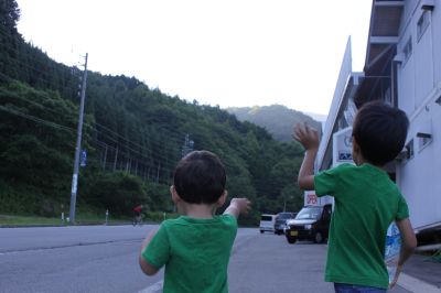 八方ヒルクライム 2011.7ヒルクライム総仕上げで八方に出てきました。同日に修善寺にて実業団ロードレースが行われていましたが、ヒルクライム同様、そのレース形態に必要なフィジカルが完成するまで、着争いはできないことは分かっているので、見合わせしました。当日は雨・・・。せっかくなら天気のいい日に記録更新し、家族と八方ヶ原山頂自然散策したかったのですが・・・。家を出るときは雨が強く迷いましたが、とりあえずみんな用意もしたし、家族そろって出かけることにしました。もし、雨が強ければなかがわ水遊園に行こうとも思っていたので、ちょっと消極的な出発でした。八方についてみると、雨が降ったりやんだり。参加人数も70人程度だし、早く終わって家族と遊びに行く時間もありそうだから、参加することにしました。30秒間隔でスタートしていたので最終走者の自分でもいつもよりかなり早く番が回ってきました。 子供たちは雨がやんでいるときはバッタ取り小雨の中スタート家族が車で応援してくれました(八方は普段のレースじゃありえないこんな応援ができるので楽しいです)。家族が応援してくれましたが、雨だからかなかなかスピードに乗れません。いつもはしないダンシングを混ぜながら走っていたためか(試したかった)?初めの5kmは結構苦しく、大丈夫かな????と思っていました。雨がまた降り出して、サングラスが曇って遠くが見えなくなりました。前が見えなくなったので、シッティングのみに切り替えると心拍が安定し、踏めるようになってきました。前が見えない中、この辺がゴールにつながるストレートかな??と思っていると目の前にゴールが・・・・。スパートもまったくしないままそのまま走ってゴールしてしまいました。結果は驚きの41分38秒悪いコンディションの中またしても前回から1分近く更新6月後半から休みの日は、朝10時までの練習時間を家族がくれているから毎週山実走できているからかな? ありがとね。 結果として出たのはみんなのおかげです。八方ベスト10に返り咲きました。たのちゃんはパパが1番になったら仮面ライダーの映画にいけることになっていたから大喜びでした。お昼前に終わったのでなかがわ水遊園にアマゾーーーンを見に行くことになりました。ザリガニをつかめるようになりました。たいちゃんはヒトデピラルクーにはみんなびっくりたいちゃんは帰ってから「また行きたいなーー」と言っていました。八方からは30kmだから時々行こうね。
