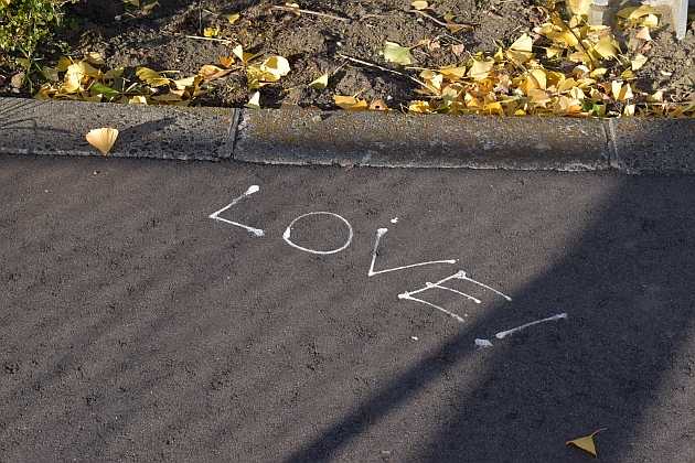 ん !! 歩道に落書き ? 誰が書いたのか 塗料で書いてる