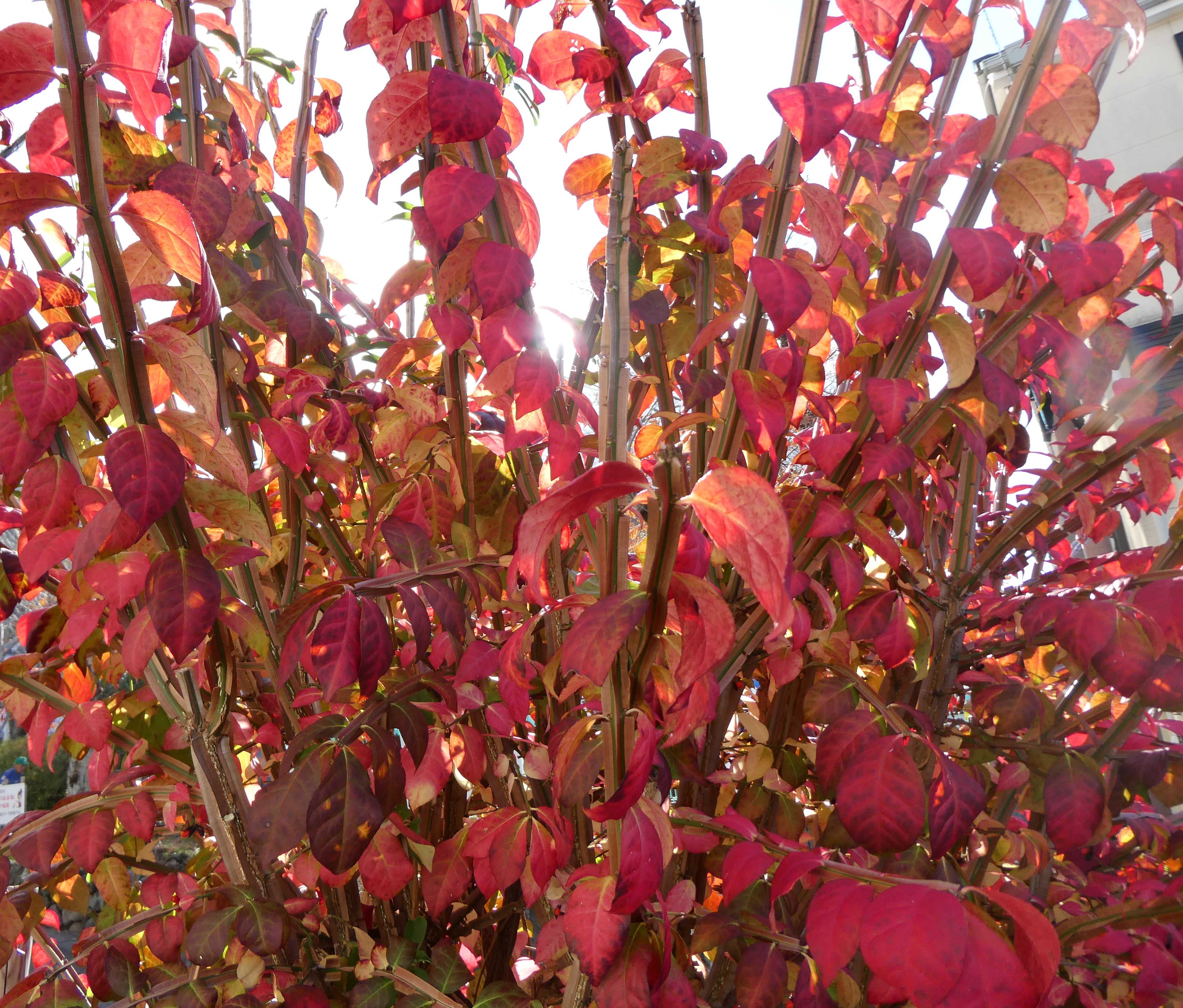 庭のニシキギが真っ赤 世界の三大紅葉の一つ 赤い実も可愛い フェンスに近く…