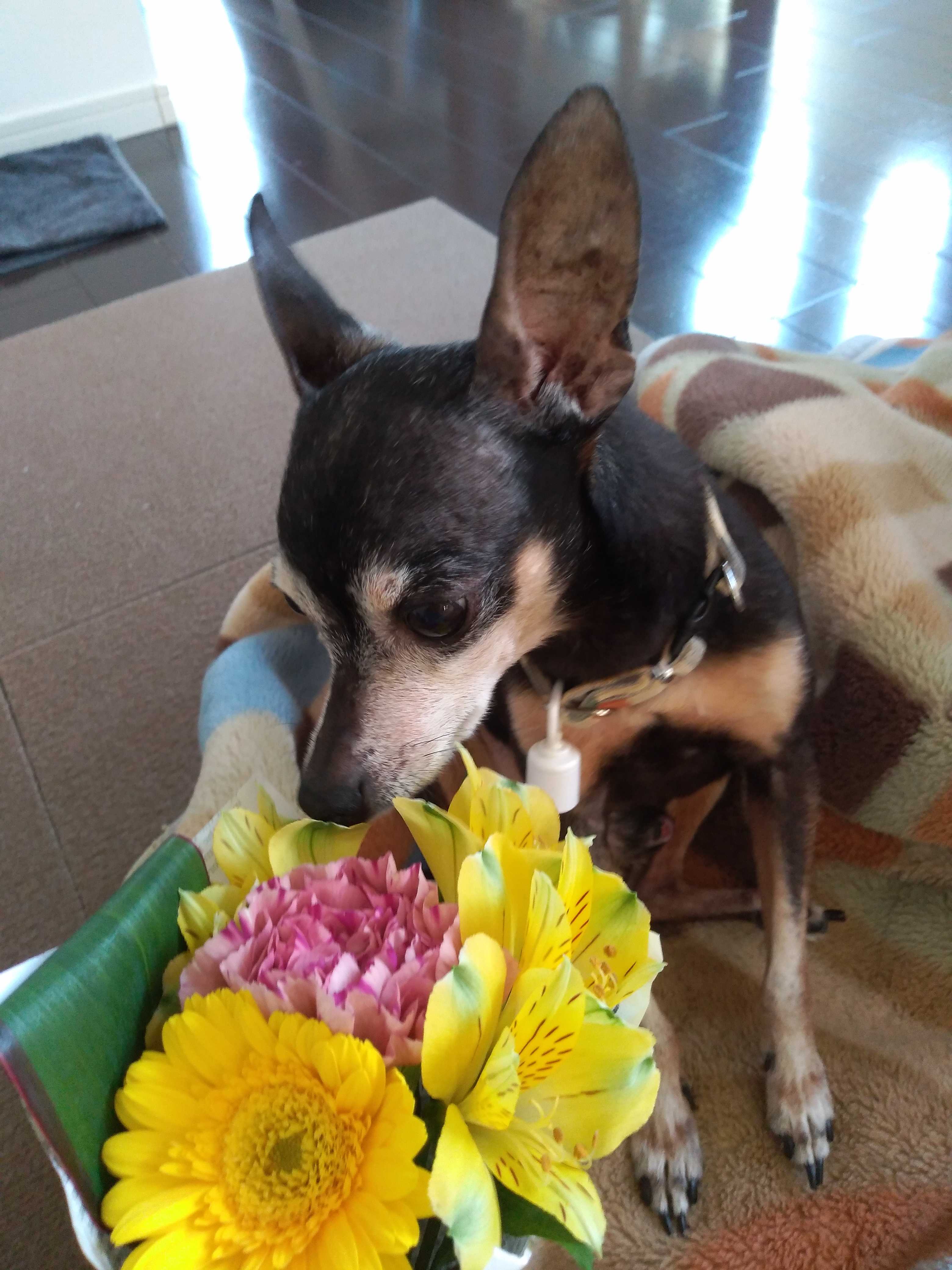 春の花をクンクン。今はちょっとポッチャリのお腹のパッチ