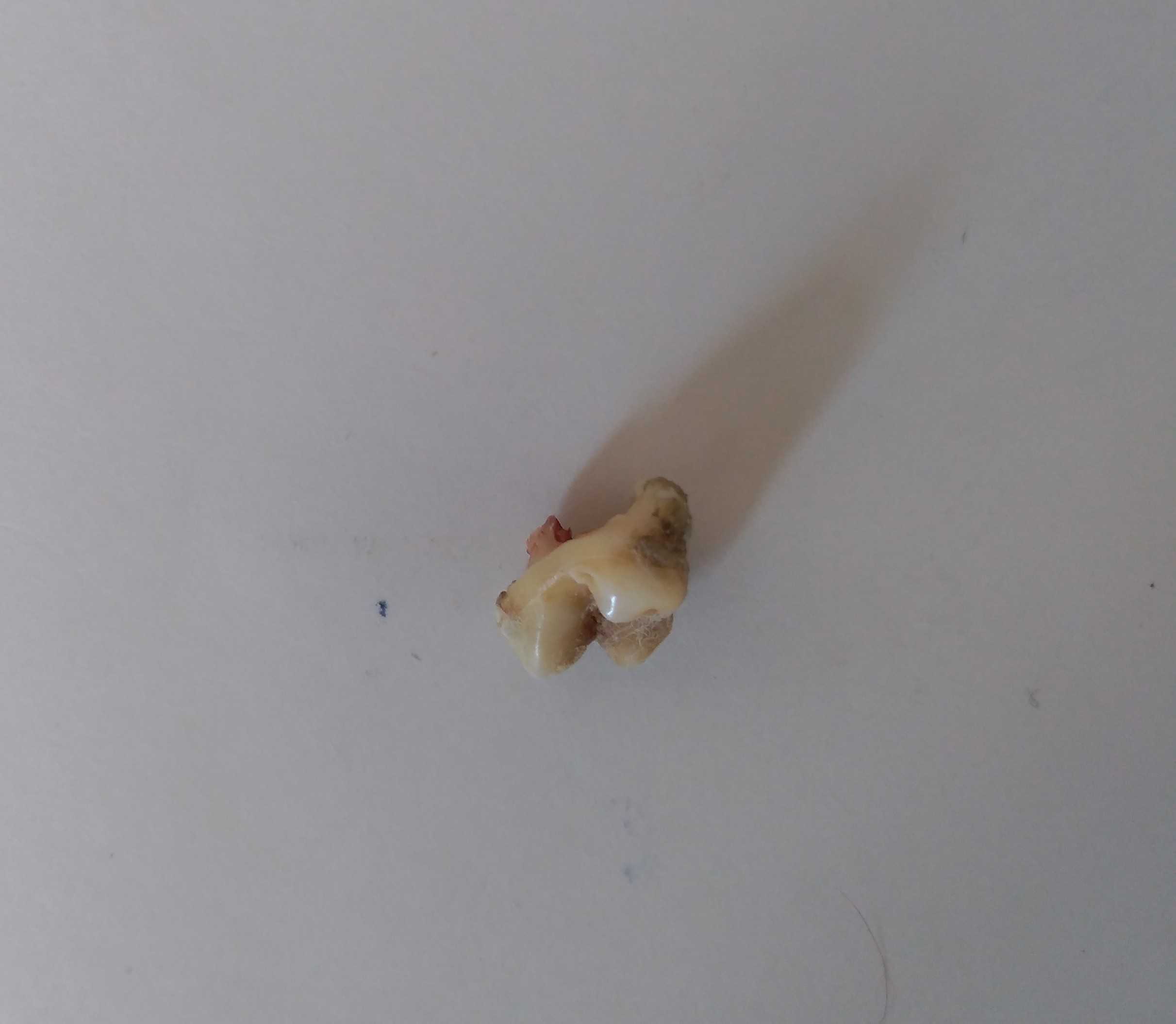 抜歯した歯。頬側の根は黒い歯石がびっしりとついていました。