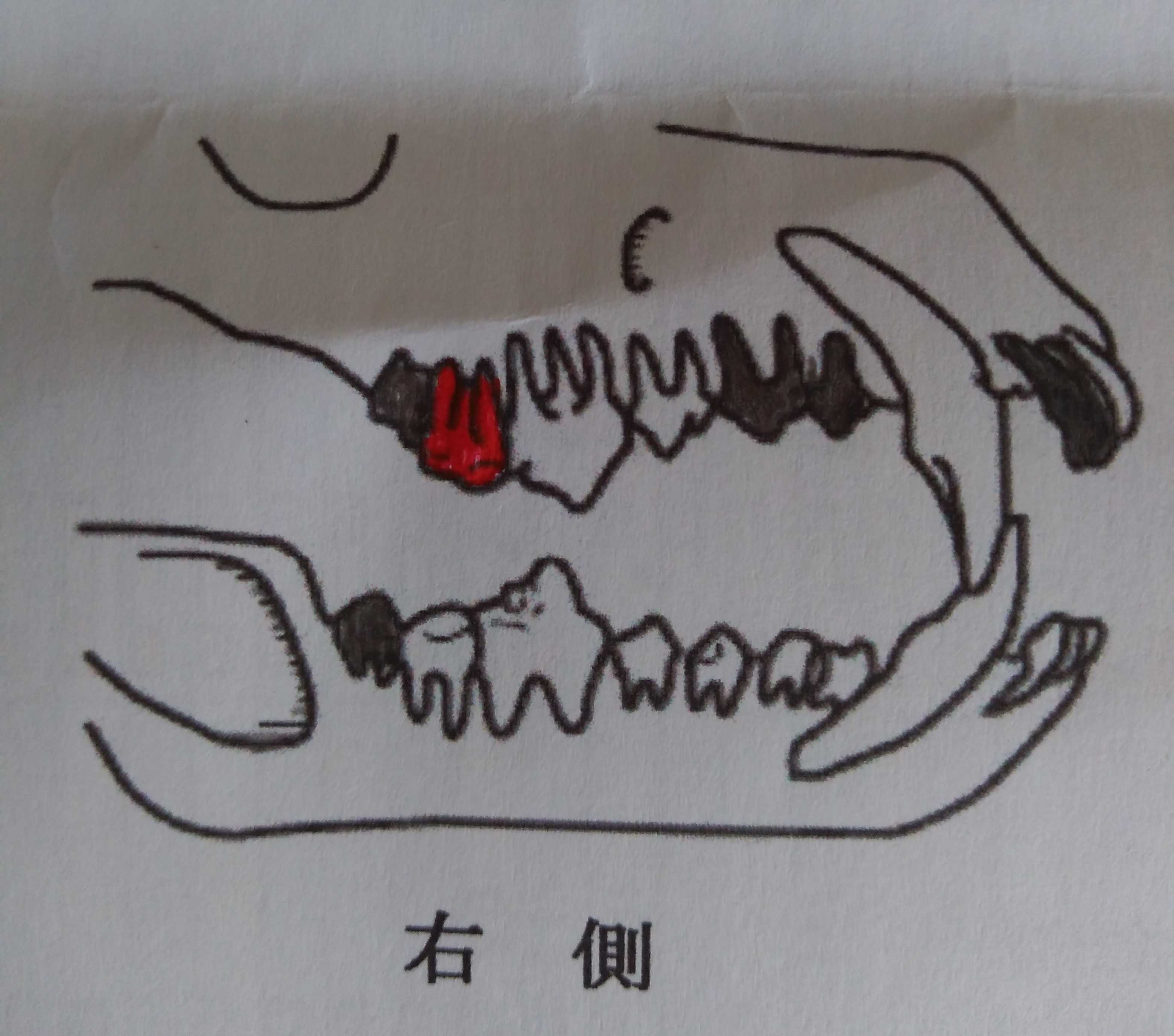昨日、ジョウの右目の下の腫れが繰り返すため、レントゲン検査などの精密検査と治療のため、全身麻酔をかけた手術をしました。実際にレントゲンを撮影したところ、右上の後臼歯の周りの骨(歯槽骨)が歯周病のため、ほとんど溶けており、ぐらつきもある状態だったとのことで、抜歯となってしまいました右目の下の腫れは恐らく、この歯が原因だろう、とのことです。 赤く塗られた歯が今回の原因となった歯 抜歯した歯。頬側の根は黒い歯石がびっしりとついていました。 半年前に歯石除去をしてもらっていたのですが、歯肉より下の部分の歯石除去まではやはり難しいのですね。根の方まで歯石が付いているので、歯を支える骨がほとんど溶けていたことが分かります。こうならないように普段からの歯みがき、お口のケアは本当に大事だと実感今回腫れたほう部位に近い右眼が左眼に比べて白い濁りが強く(水晶体の濁り)なってしまい、今後そちらも経過観察することに・・。また、今回の手術では、抜歯をした際に静脈に近かったらしく、出血も多かったようで、昨日は自宅に戻ってからも食事は少な目でウェットタイプのみで様子をみている状態です。今日はジョウも少し落ち着いてきましたが、昨日の疲れもあるのか、ぐったりと寝ています ジョウ、痛い思いさせて、本当にごめんねしっかり、治して、歯みがきも頑張っていこう