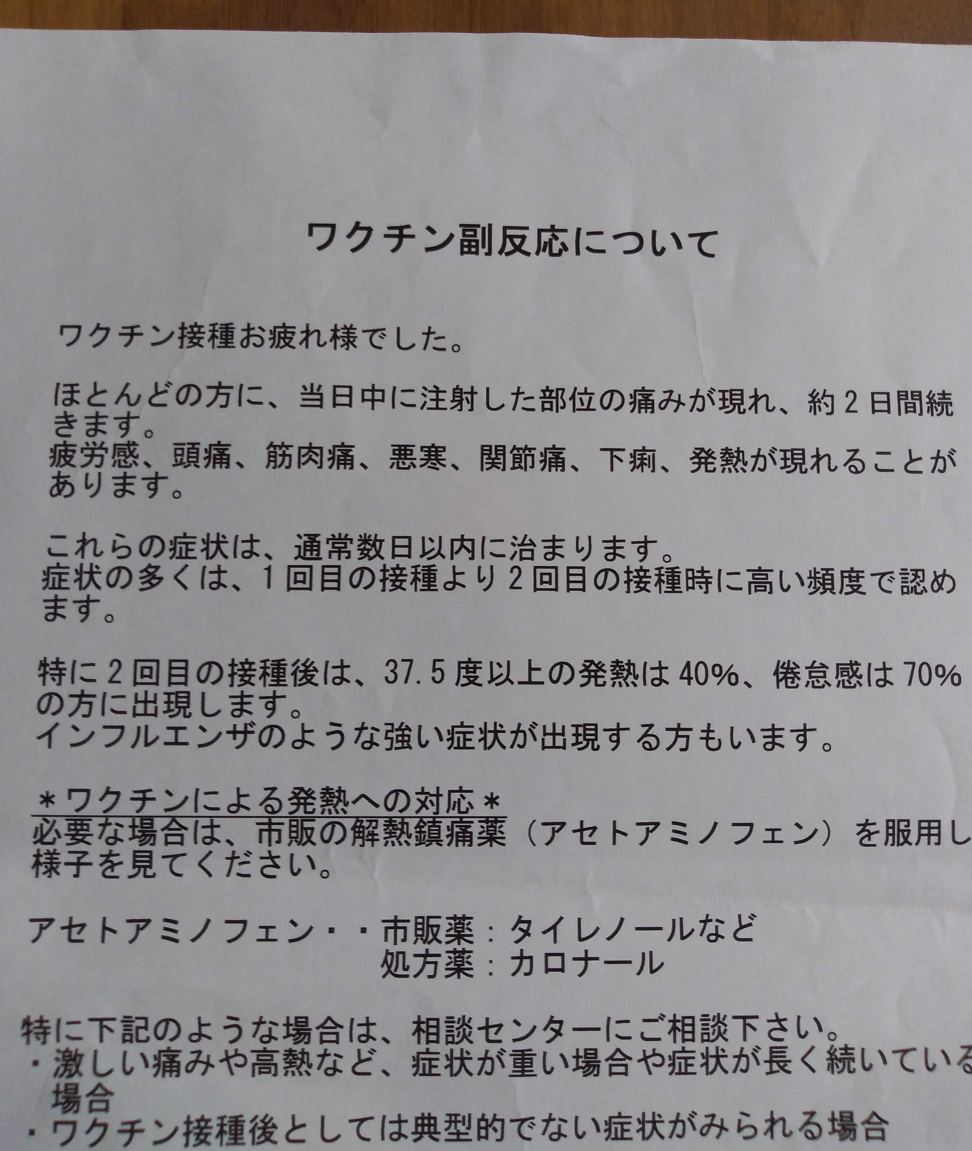 先日、ジョウパチママは、新型コロナのワクチン接種の2回目を終了しました。自分が体験した副反応や職場で接種した方の体験談などをまとめてみたいと思います。 ジョウパチママ(40代女性)の体験1回目の接種新型コロナのワクチンは、副反応を心配していたので、1回目の接種前はドキドキしてました会場では、問診票の項目に漏れがないかをチェックし、体温も特に事前に記載したものでOKで、改めて計測もなく(忘れた方は表面温度を計測する機器の体温を記入してました)スムーズに医師の所へ。問診では、「特に体調は大丈夫ですか?」「はい」のやり取りで終了。そのあと、すぐにチクリ。医師の前に座ってからは、10秒位で終了しました。その後、経過観察のため、別室で15分間待機のため座って待つことに。特に、看護師さんたちの声掛けや確認もなく、15分を自分で計って、時間が経ったら、適当なところで自分で勝手に帰る・・・という感じで一回目を終了しました。職場で20人ほどで接種しに行ったのですが、接種後に気分が悪くなったり、という人は1日目も2日目も居ませんでした。1回目の接種後の様子接種後の当日職場に戻って仕事を継続していたのですが、約3時間後から接種したほうの腕が少し重くなってきましたが「なんだか腕が重いけど、こんなものかな・・」といった感じでした。1回目接種後の翌日翌朝は軽度の頭痛がありましたが、まあ、なんとか仕事に支障はない程度で通常通りに出勤。接種したほうの腕は打った日より重くて筋肉痛ともなんとも言えないような痛みで、腕を頭の方に挙げることが辛く、服の脱着がちょっと辛かったです。1回目接種後の2日目頭痛はほとんど治まり、腕の痛みや重さも大分よくなりました。腕を動かすと、「ちょっと痛いかな」程度。3日目以降は特に通常通りの生活に戻りました。2回目の接種周りの声では、2回目の副作用の方がキツイと聞いていたので、「嫌だな・・」と思いつつも接種。接種自体は1回目と同じように、すんなり終了。2回目の接種後翌日の様子接種後、当日1回目接種した時と同じように、約3時間後に接種した腕が重くなってきましたが、それ以外の症状は特にありませんでした。2回目接種後の翌日翌朝、1回目接種後の翌日の状況と比べて明らかに頭痛の程度がややひどい感じでした。ただ、その日も仕事が立て込んでいたので、出勤。仕事に集中すると、そんなに支障がない程度でした。が、午後になると、だんだん体全体が重く、だるく、明らかに熱っぽくなってきました。職場の体温計で計測すると「38度!」。仕事も集中できなくなってきたので、その日は午後、早退。帰宅して1時間程、横になっていると、少し楽になってきたので、体温を測ると「36.8度」と下がっていたのとすこしだるさも軽減されたので、家事や夕食の準備を始めました。さあ、夕食が出来て食べよう、と思ったら、また「だるさ」「熱っぽさ」があったので、体温を測ると「37.8度」。油断するとやはりダメなようで、その日は早めに休むことにしました。その日の夜中(たぶん深夜1~2時ごろ)、だるさと体の熱っぽさで目が覚めてから寝付けず、アイスノンを枕にすることで少し眠りました(体温を計っていませんが、熱はあったと思います)。2回目の接種後2日目の様子午前中は少しだるさと頭痛は残っていました。起床時の体温は「36.7度」(いつもは朝は「36度前半位」)。ただ、ずいぶんと楽になってきました。午後からは、だるさ、頭痛もほとんどなくなり、腕の痛みがややあるだけになり、ほっと一安心。3日目以降は、腕の痛みが少しある以外はほぼ通常通りの生活が可能でした。他に接種した人の声職場では色んな年代の方が接種を受けましたが、傾向としては若い人の方が副反応が出やすく、ひどい傾向があるようでした。同じ職場の20代男性→1回目も2回目も接種後の翌日から頭痛がひどく起き上がれない状況になり、2日間休んでいました 症状としては、「頭を金づちで叩かれてる痛さ」だったようです。同じく同じ職場の30代女性→1回目、2回目とも接種後翌日に発熱。39度まで上がったそうです(2日目には解熱)。一方、同じ職場の50一歩手前の男性→軽度の頭痛と腕の痛み程度で1回目と2回目も終了。日常生活に支障が出る程度の症状がなかったようです。以上より、傾向としては、1回目より2回目の方が強く出るようですが、若い方は両日とも副反応が出やすいということと、全員、共通して翌日が一番副反応が強いようです。接種後にもらった注意事項にも類似のことが書いてありますジョウパチママがワクチン接種を予定している方へのアドバイスをするなら、「接種後の(特に2回目)翌日は休める体制にしておいたほうがよいかな」ということです。ちなみに、接種後の副反応の発熱や痛みの対応には、解熱剤として有名なロキソニンではなく、子どもや妊婦さんにも使える少し弱い鎮痛剤が推奨されています(注意事項の紙に)。ジョウパチママ家には子ど