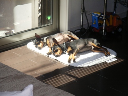 梅雨明けして以降猛暑日が続いていますPKJと嬢を連れ、海の日の連休初日に川崎に帰ってきたジョウママです。ちょうど帰る日は関西の梅雨明けでとっても蒸し暑い日。おまけに帰りの新幹線が機械トラブルで1時間も遅れるというハプニングがあり、遅延のために自由席からあふれた乗客が指定席車輌まで乗り込んでいて混雑のためクーラーもほとんど効いていなかったせいか、坊が大量に吐いてしまい大慌てでした。坊も本当にかわいそうでしたが、ペットカートに予定より1時間も長くいたジョウとパッチもさぞ疲れたことだろうと思います。ともあれ、無事に帰宅してからは3ヵ月ぶりの自宅にはすぐになれ、くつろぐPKJ。こちらに着いた翌日には関東も梅雨明けし、猛暑が続いています。さすがに昼間は暑いからかあまりお外にはでませんが、室内では暑さにも負けず日向ぼっこのジョウとパッチ。本人たちは気持ちいいのでしょうが、「こんなに暑いのに・・」とちょっとあきれるジョウママです