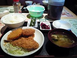 きょうは揚げ物でした。鰺フライとメンチカツの盛り合わせ。ご飯、フライ盛り合わせ、味噌汁、焼き海苔、生卵、お新香の6品。相変わらず激安です。