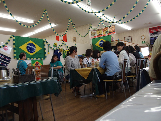 先月,群馬県の大泉町,通称ブラジル村へ行ってきました。ブラジルの肉料理,シュラスコを食べるためです。バスツアーの一環として,このバイキングが組まれていました。 店はスーパーの一角にあり、11時,早めの昼食となりました。店内です。一人で参加した我が輩は,隅の席に案内されます。慣れているので,端っこでも苦にはなりません。 シュラスコの前に,前菜のバイキングが。これを食べ過ぎると、本番に影響します。 とりあえず,血糖値の上昇を抑えるために,野菜類を中心に選んで皿に盛り,自席へ運びました。取りすぎた感じもしますが、ビールは飲まないので,お腹が一杯になることはないでしょう。 いよいよお目当てのシュラスコです。この料理は,串に肉の塊を刺し,岩塩をまぶして炭火でじっくりと焼いたもの。そのままテーブルへ運び,大きなナイフで削ぎ落とします。客はトングで受け取り,皿に移すのです。ケバブに似ていますね。ギャルソン(?)の一人に,きれいなお姉さんがいました。牛,豚,鶏の7種の部位が,次から次へ運ばれてきます。ビールの代わりに,マテ茶で喉を潤し,ついでに舌の油を洗います。寿司におけるほうじ茶の役割を果たすのがマテ茶。レストランの壁に,長友と本田2選手のペナントが貼ってありました。ブラジルW杯に便乗した,いや利用した商法が垣間見えます。昼食時間は90分でしたが,60分もすると、満腹に。最後にコーヒーで締めくくりました。いやあ、堪能しましたね。当分,肉は控えます。ご馳走さまでした。