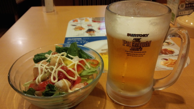 アボガド、森のバターといわれています。 不飽和脂肪酸が豊富。 果肉は柔らかくて食べやすい食材です。 季節限定のステーキとアボガドのサラダご飯。 身体に優しそうなので,食べてみました。 まず生ビールとサラダ。 サラダは海老と小柱のミニサラダ。 トマトやほうれん草なども添えられています。 ドレッシングは和風で、私好みではありました。 サラダご飯は、ミスジステーキに、 アボガドが2分の1個分。 千切ったレタスが少々。 和風ポン酢ソースをかけて食べます。 いや美味しい。 ポン酢ソースが実によく合います。 アボガドは何にでもよく合うフルーツ。 いや、野菜かな? もちろん,ヘルシーでもあります。 ソースが染みたご飯もグッド。 CPも最高でしょう。 これはお薦めできます。 ファミレスはお安いだけでなく,味も水準をキープ。 家族連れで混むのも納得です。 季節限定のメニュー,次は何を食べますかな。 ご馳走さまでした。