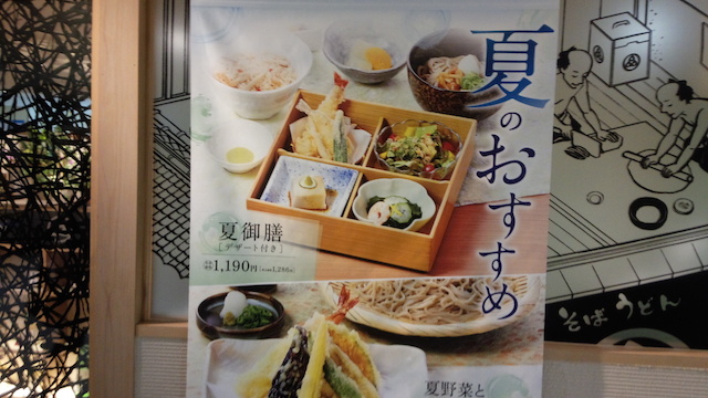 季節ごとの限定料理。 今回はそば屋で夏御膳をいただきました。 店頭に貼ってあったポスター。 暑い夏,食欲をそそります。 これが実物です。 キスと海老の天ぷら,ゴマ豆腐,胡瓜とわかめの酢の物、 夏野菜サラダ・ドレッシング、なめこおろし蕎麦、 ミニかやくご飯,お漬け物、みかん風味のわらび餅。 以前,この店で食べた冬御膳の夏バージョンです。 サラダ,おろし蕎麦、デザートなどが夏風に。 天ぷらは例によって,抹茶塩で頂きます。 蕎麦とかやくご飯で腹一杯になりました。 全体に,味的には平凡です。 突出して美味しい、とは言えません。 もちろん,不味くはないです。 刺激に乏しいので,年寄り向きといえるでしょう。 次は秋御膳に。